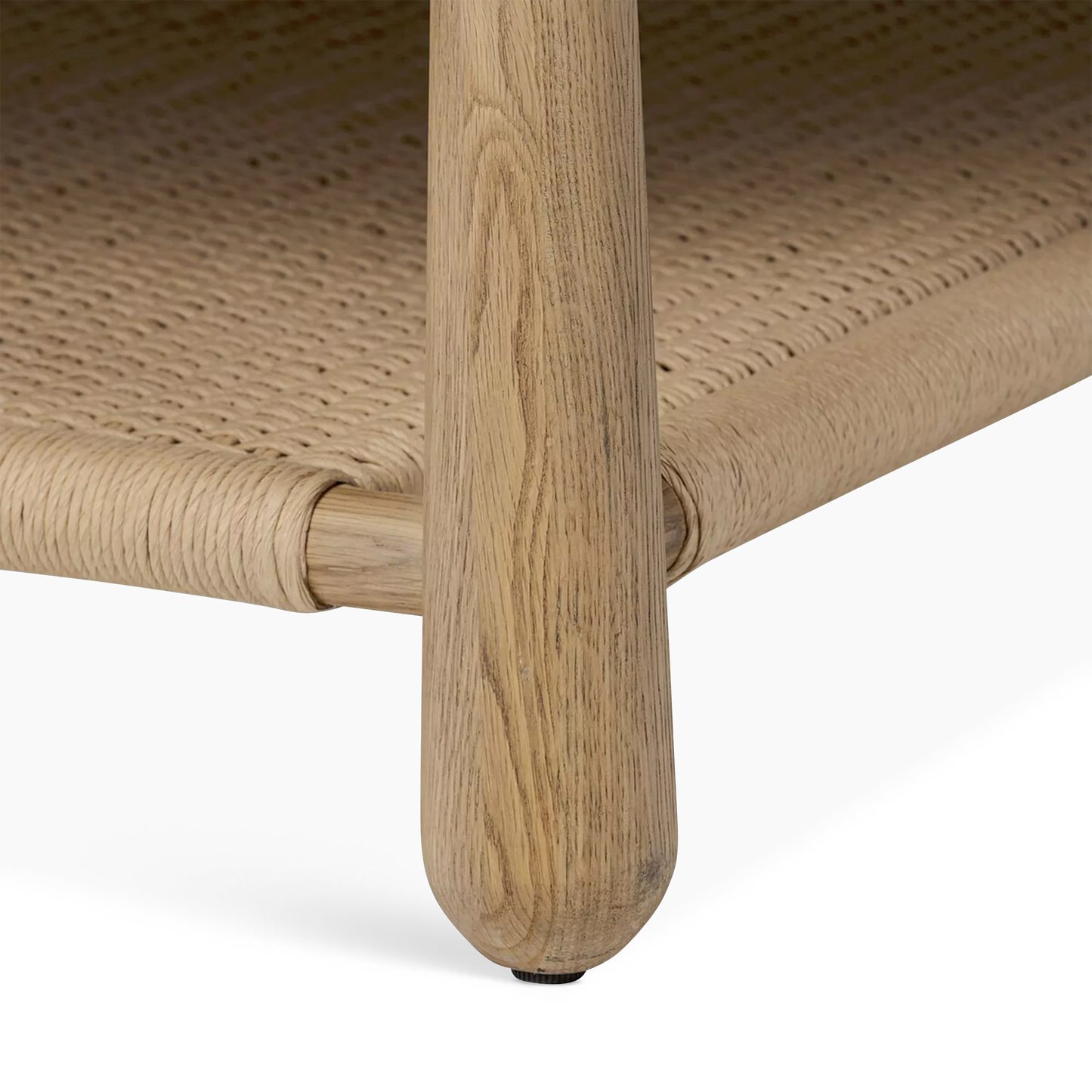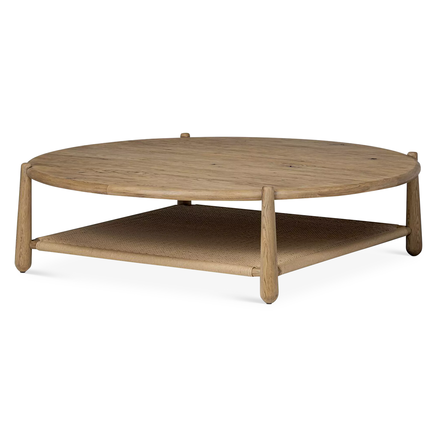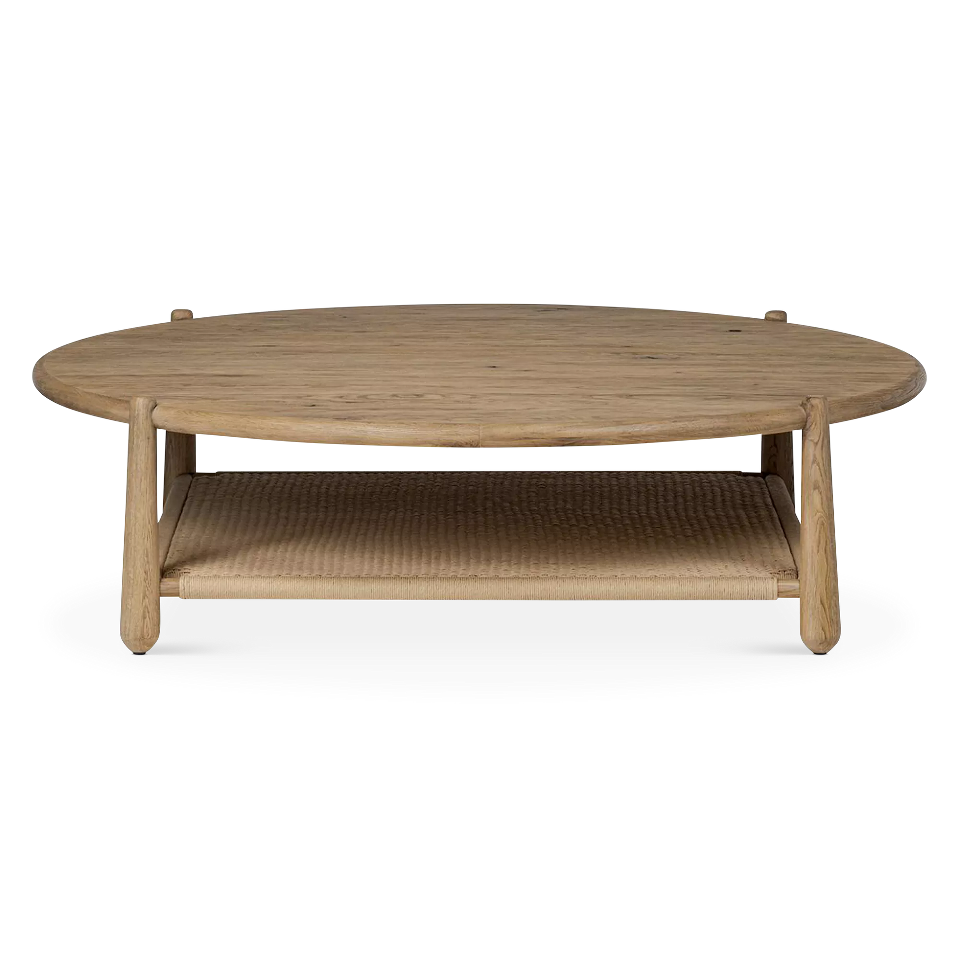 Bring warmth and texture to your living space with the Salvador coffee table. Crafted from resawn oak in an aged, smoked finish, this two-tier design highlights rich graining and natural knots that emphasize the wood’s organic character. Its rounded tabletop rests over a woven paper-cord lower shelf, adding both tactile contrast and functional storage. A thoughtful blend of materials and form, designed in collaboration between Amber Lewis and Four Hands.
