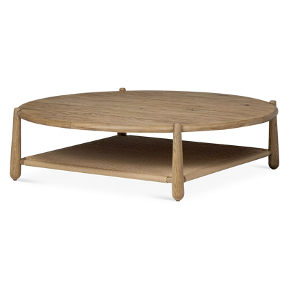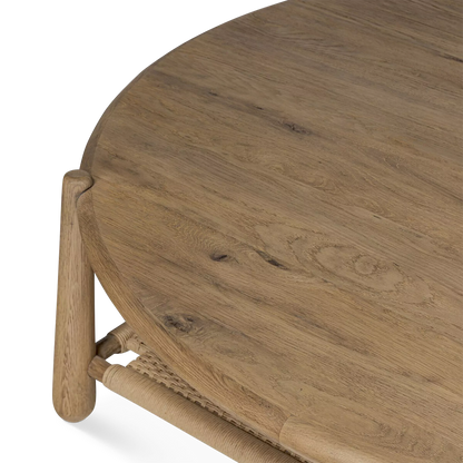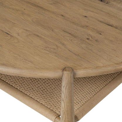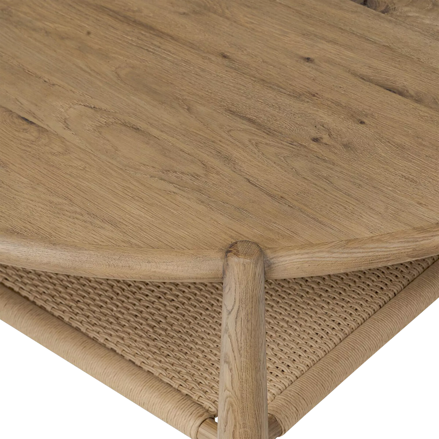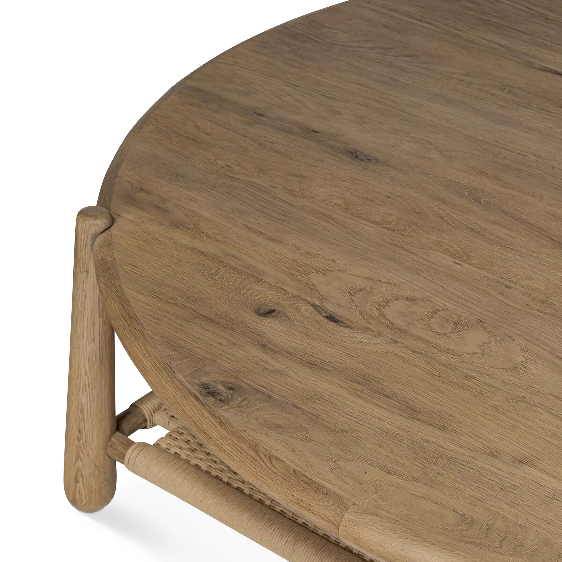 Bring warmth and texture to your living space with the Salvador coffee table. Crafted from resawn oak in an aged, smoked finish, this two-tier design highlights rich graining and natural knots that emphasize the wood’s organic character. Its rounded tabletop rests over a woven paper-cord lower shelf, adding both tactile contrast and functional storage. A thoughtful blend of materials and form, designed in collaboration between Amber Lewis and Four Hands.