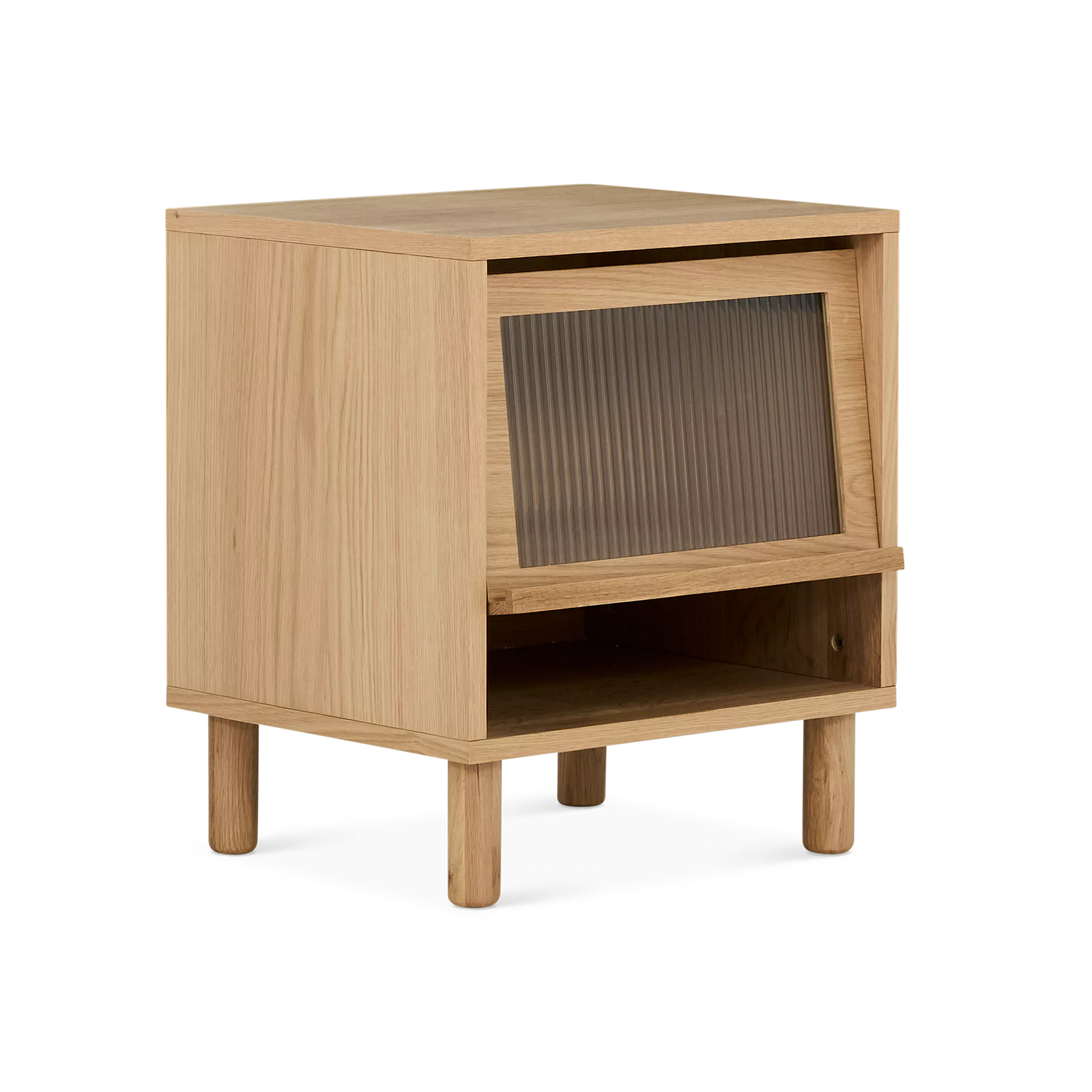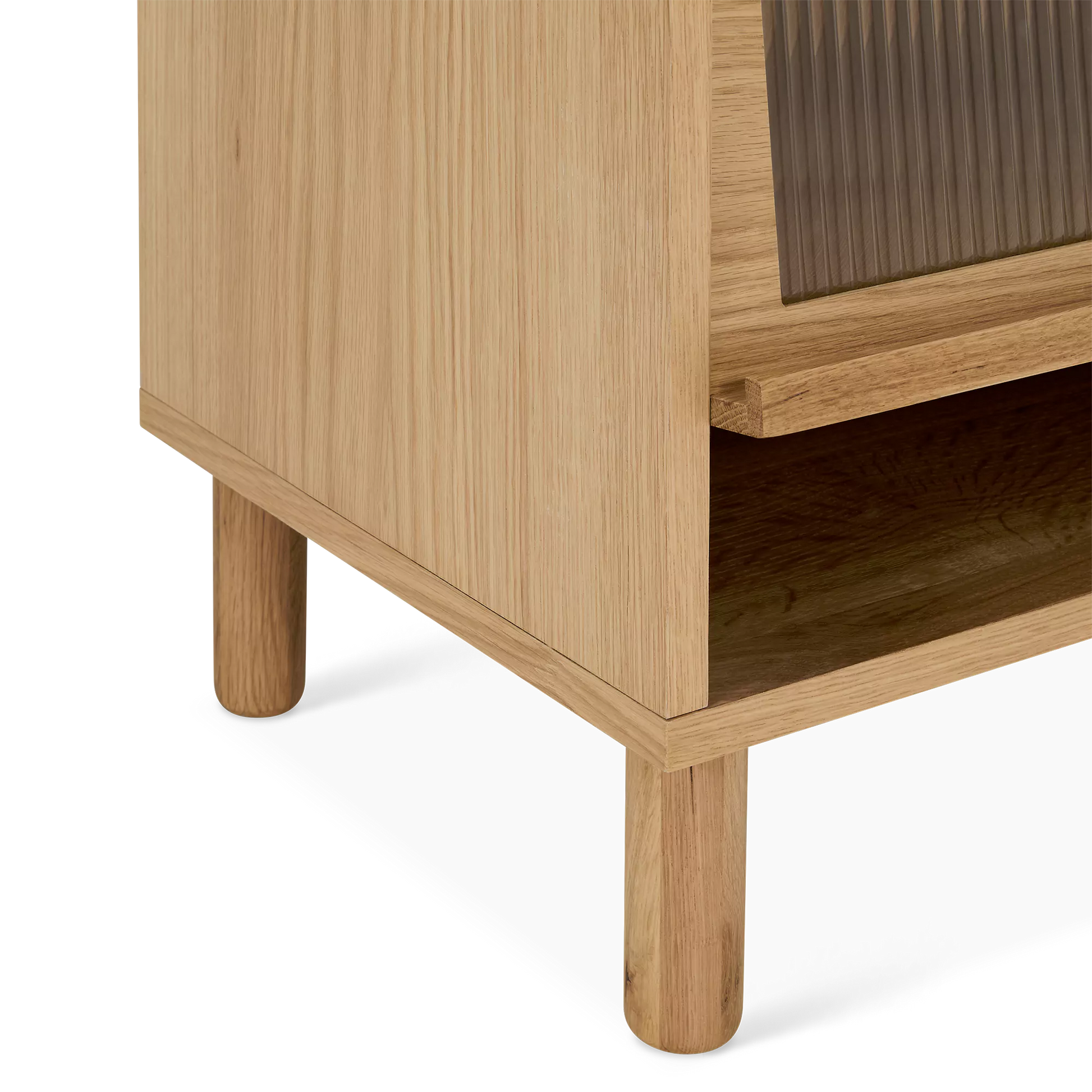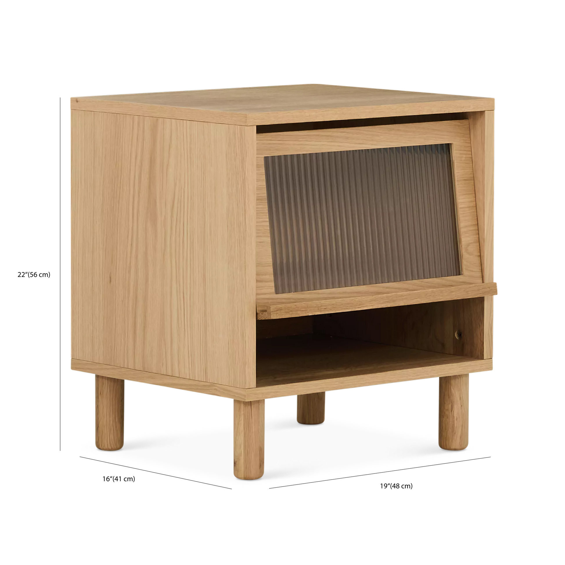 This modern nightstand is easy to love and easy to style. Made from natural oak wood, it features cylindrical legs, a linear body containing two distinct storage spaces and a removable, textured glass door.