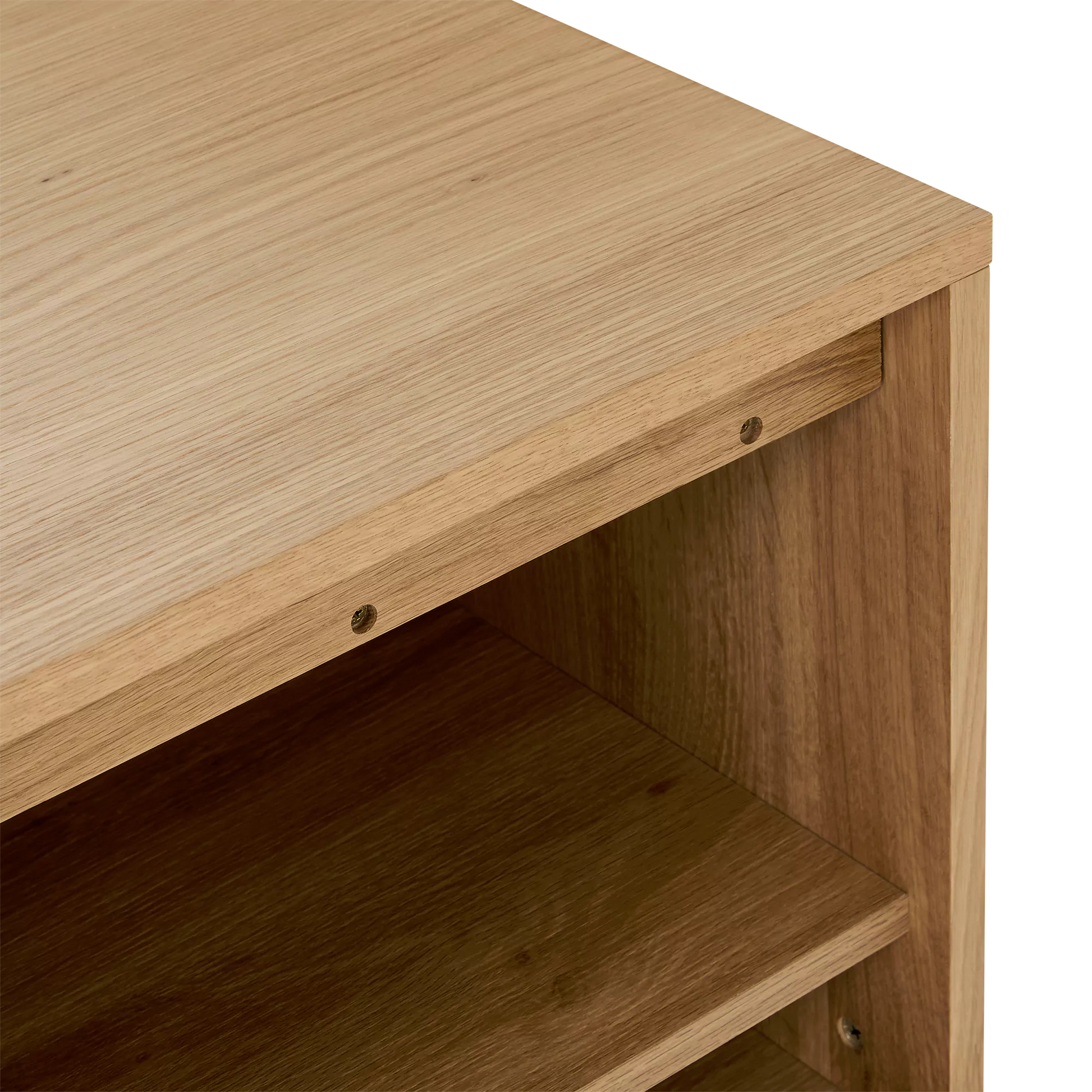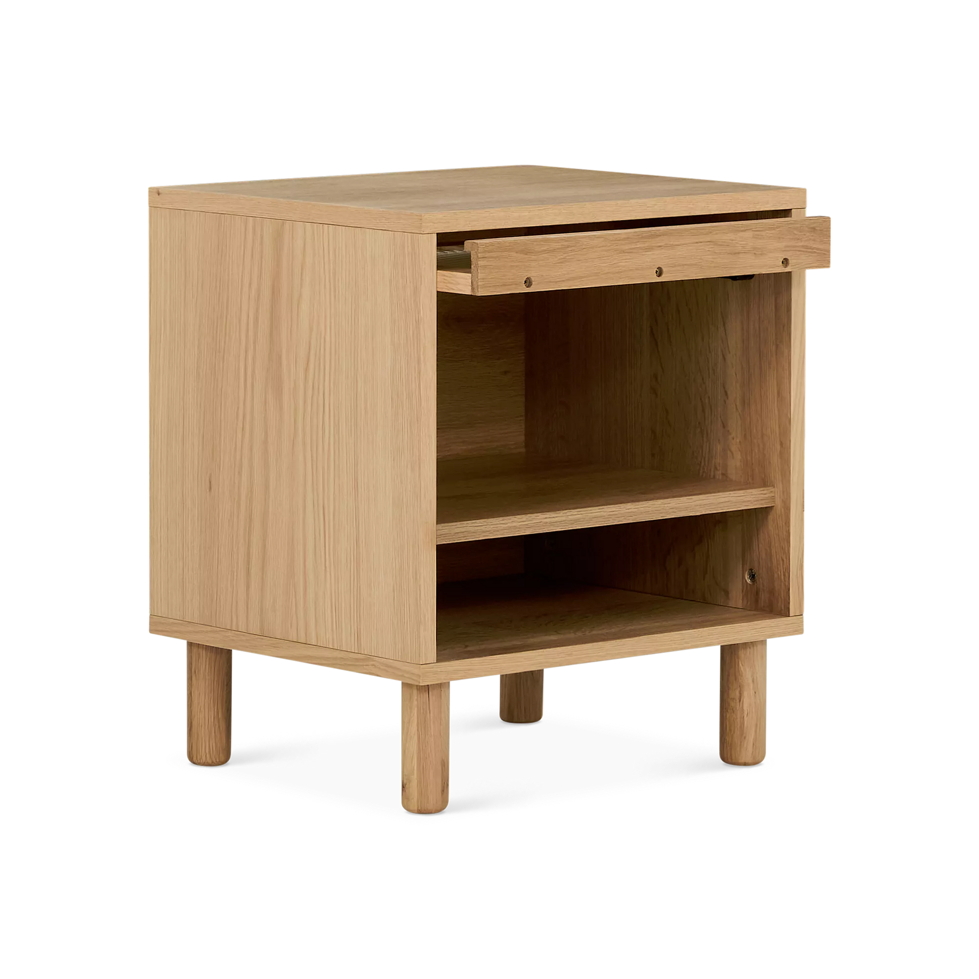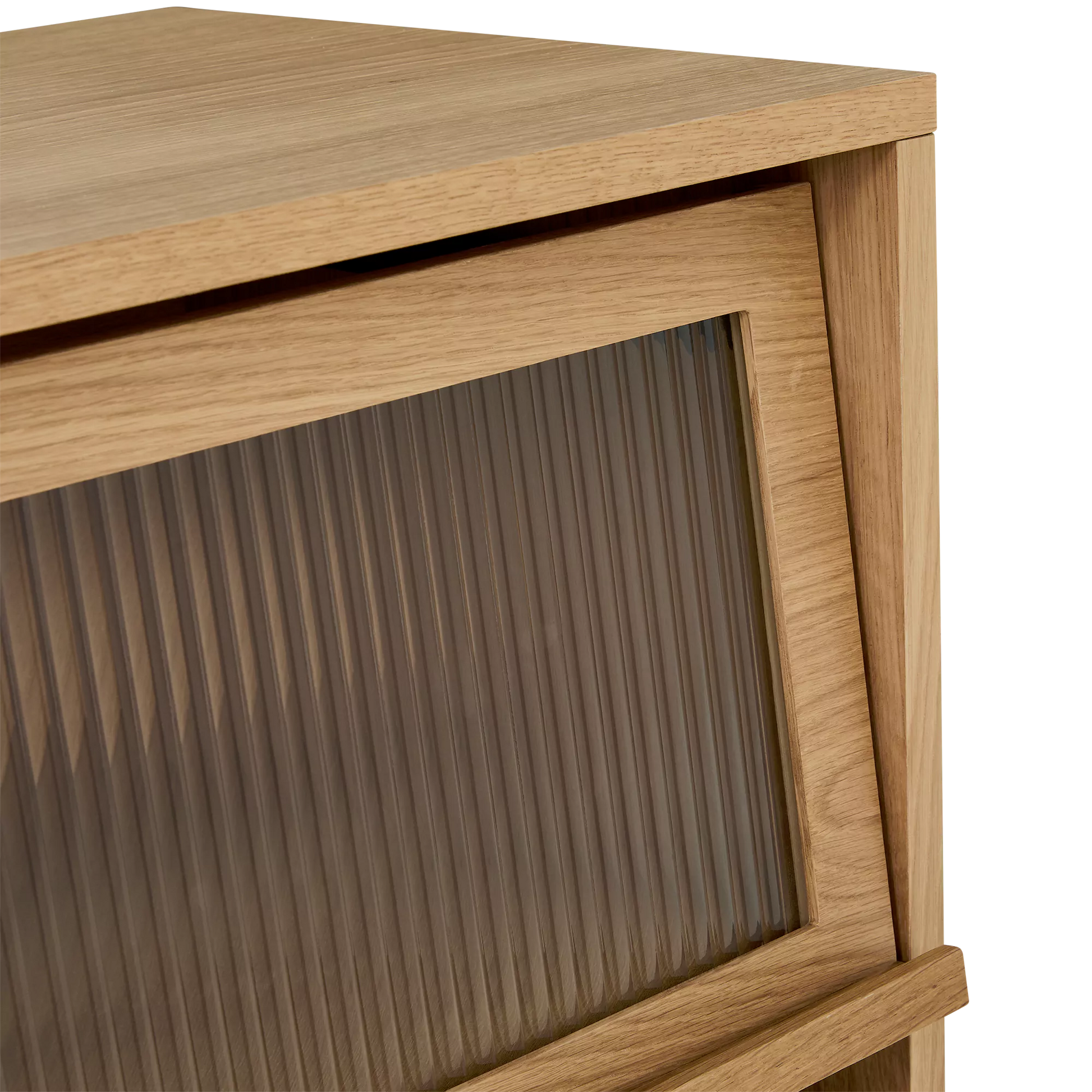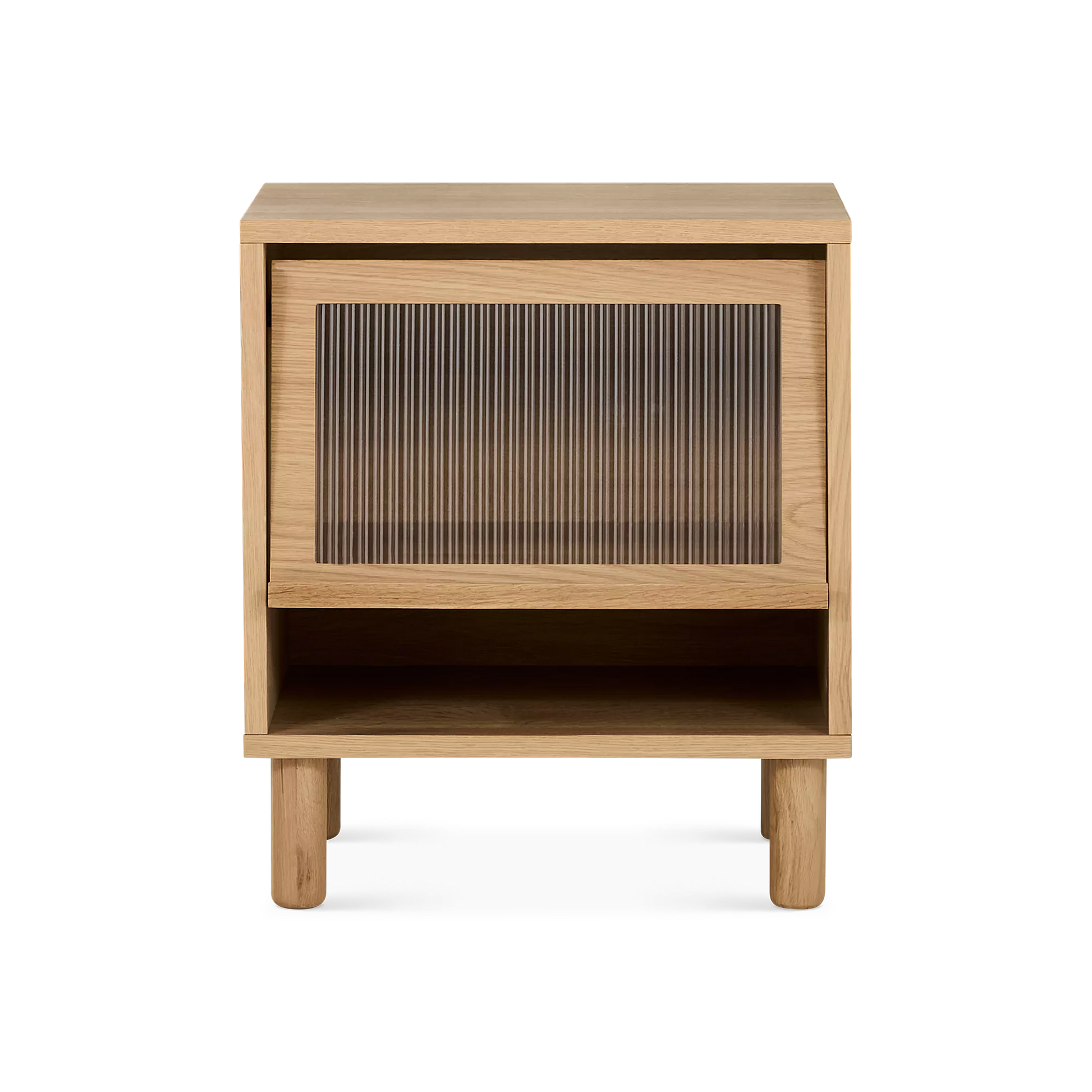 This modern nightstand is easy to love and easy to style. Made from natural oak wood, it features cylindrical legs, a linear body containing two distinct storage spaces and a removable, textured glass door.
