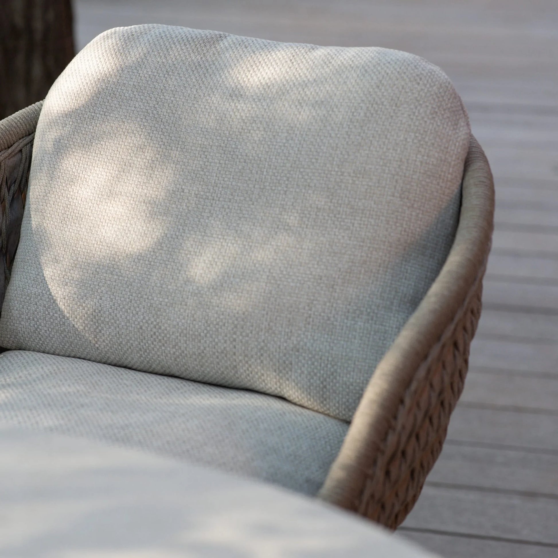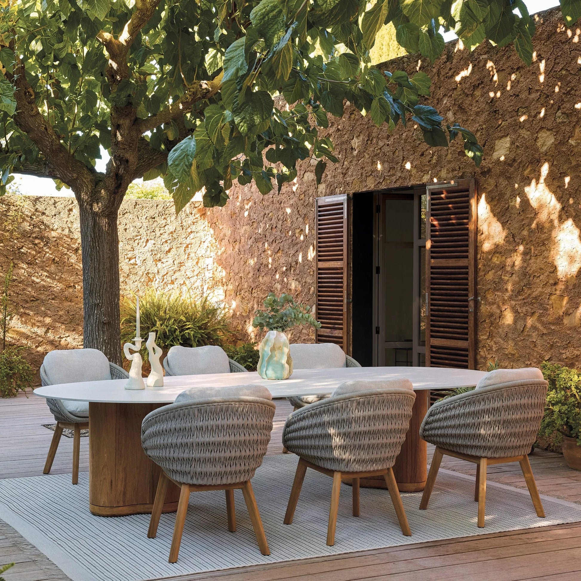 A fusion of innovation and craftsmanship, this collection by Belgian manufacturer Manutti is distinguished by organic curves that perfectly complement the outdoors and a mix of luxurious, weather-resistant materials. Indulge in the comfort of the Sandua chair for an unparalleled seating experience. Its woven seat with an enveloping shape, set on slender, teak wood legs, is topped with soft cushions for the sort of relaxation that makes you lose track of time.