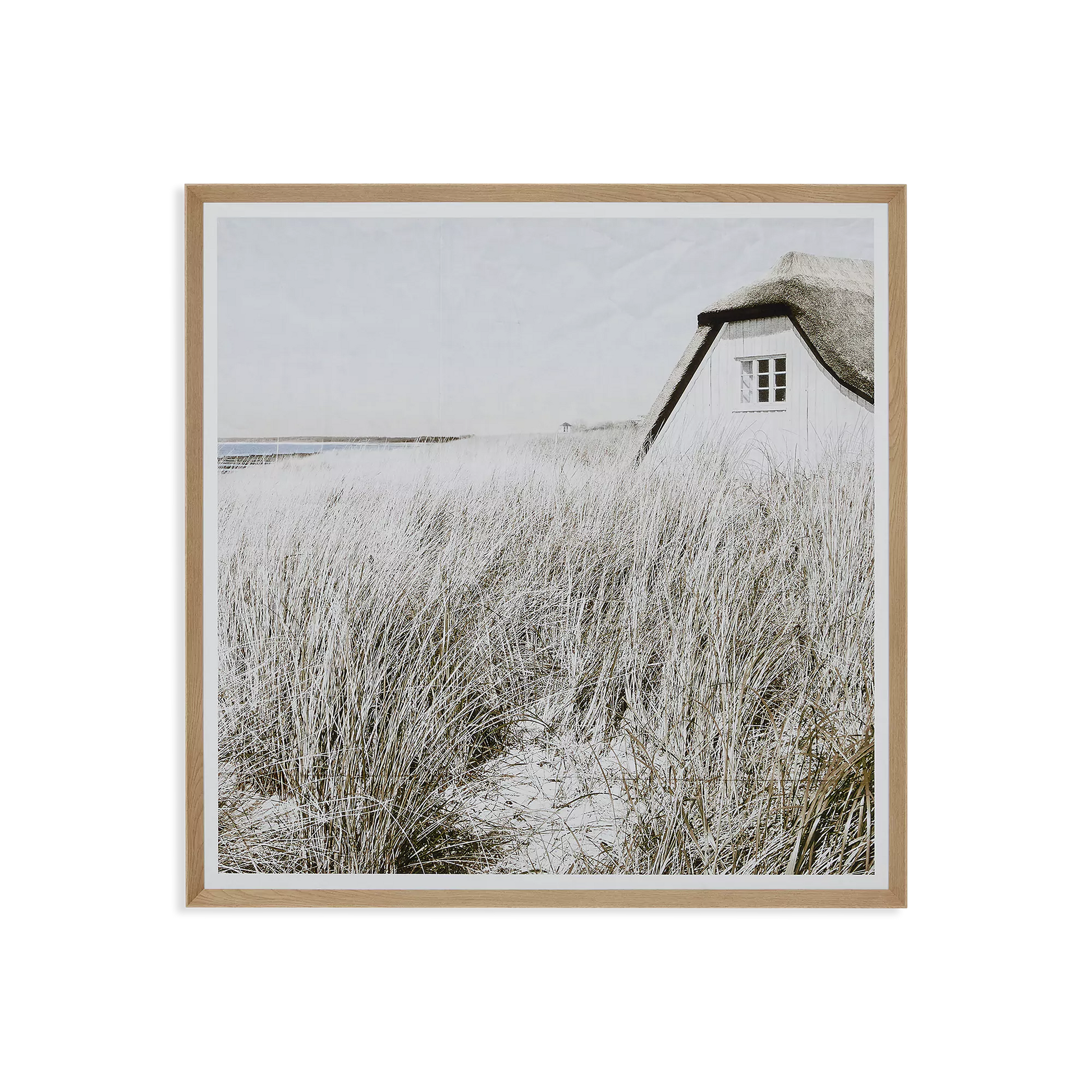 This framed, weathered photograph captures a charming coastal home bathed in subtle shades of blue and taupe. The texture of its crumpled paper and soft palette gives the entire piece a dreamlike dimension, evoking a sense of calm.
