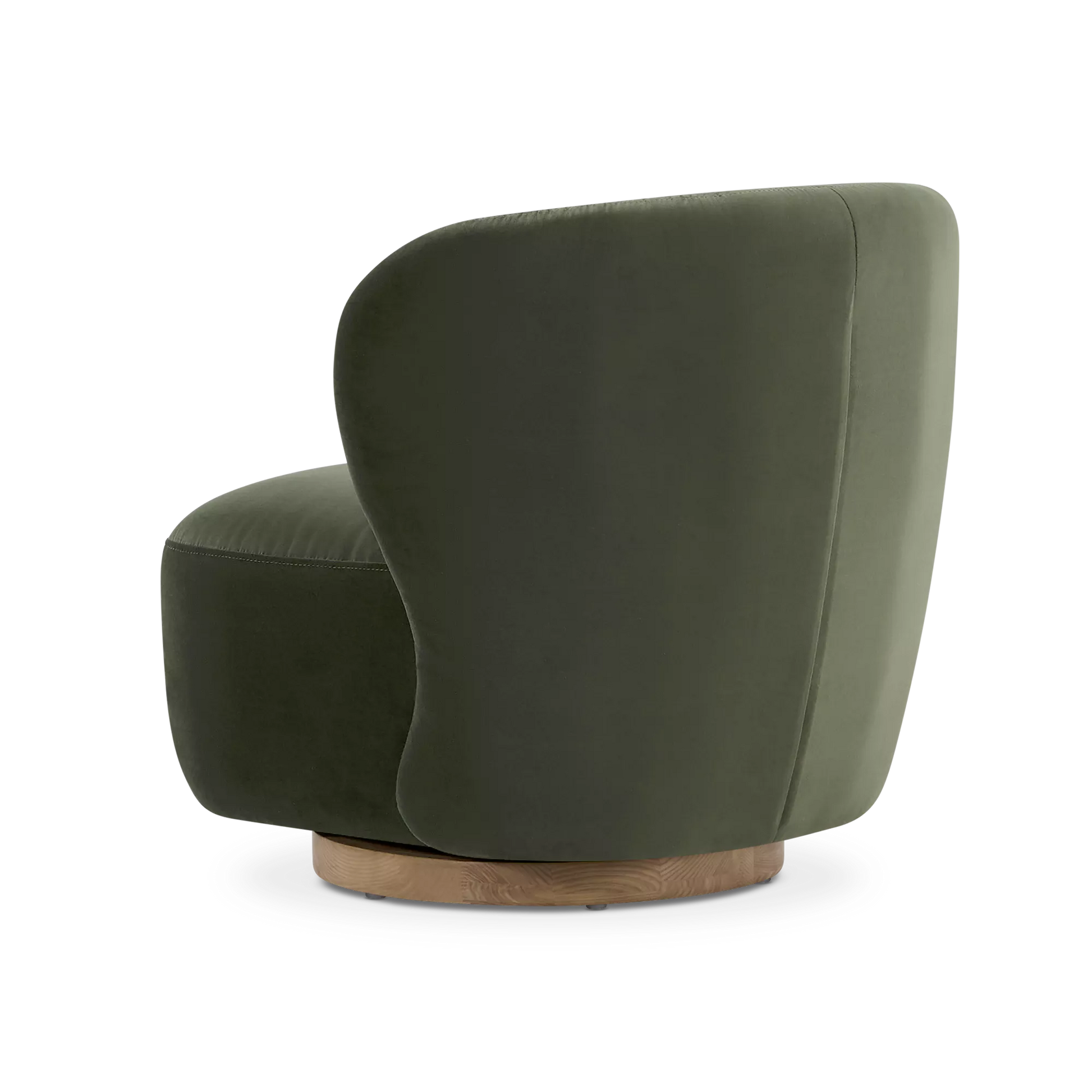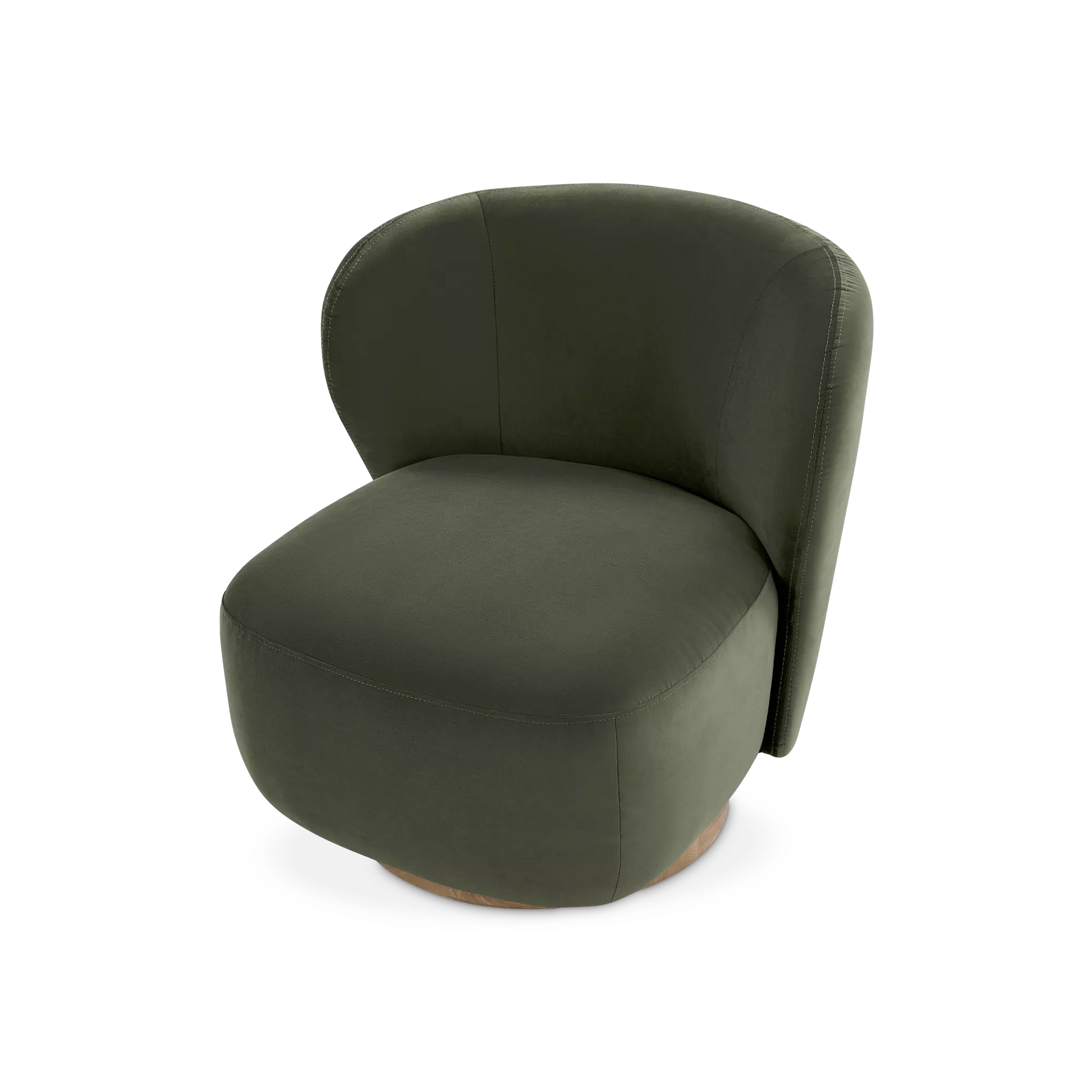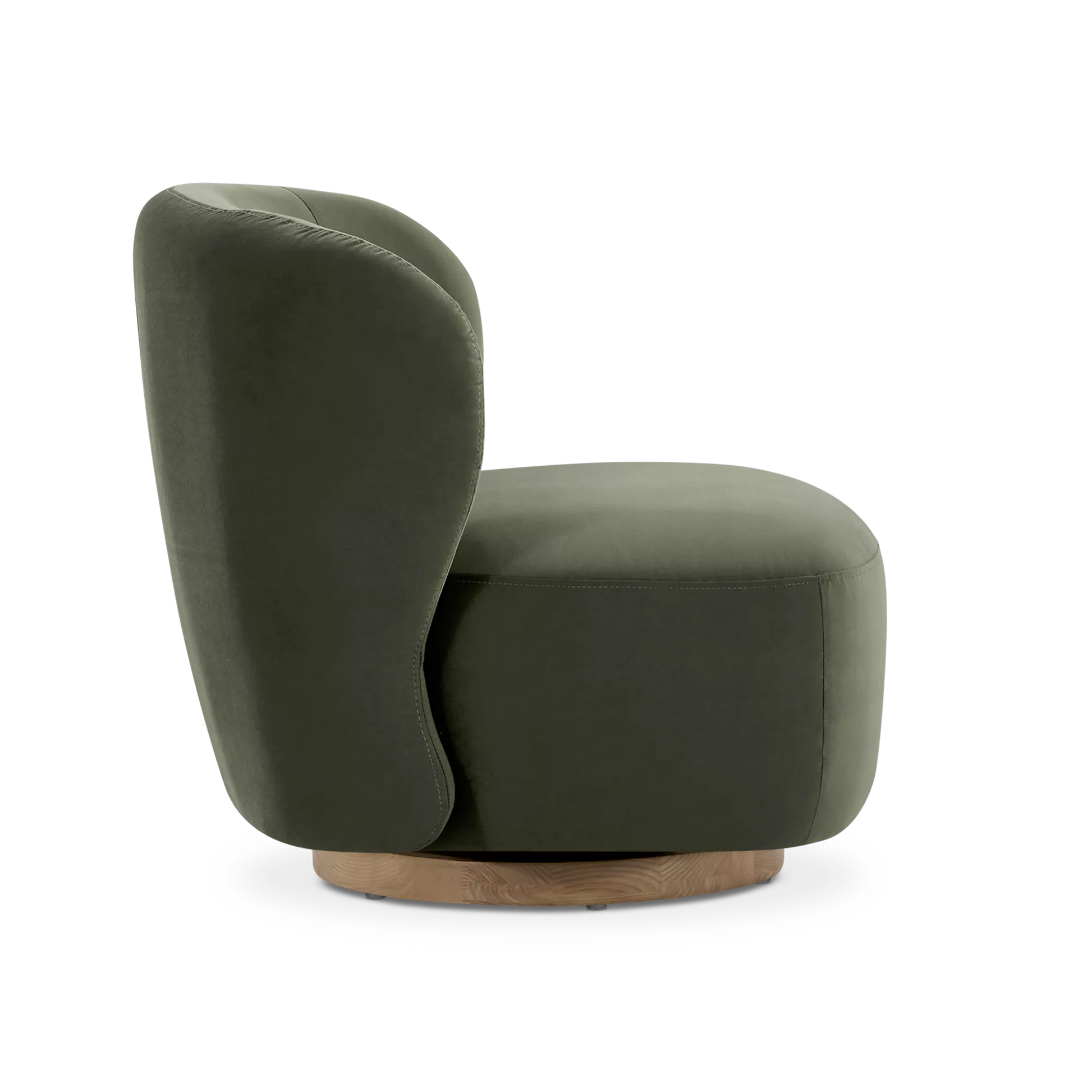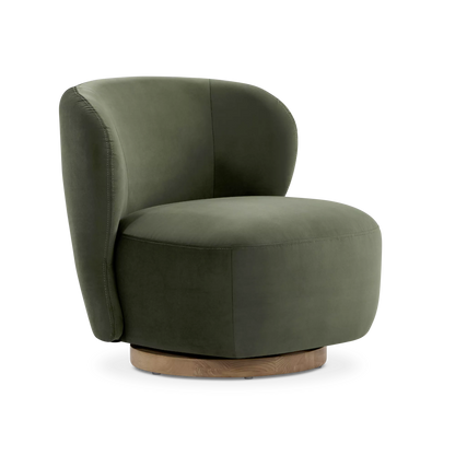 Sesame is an oasis of softness. Its velvet upholstery and wraparound silhouette without armrests make it a piece that is at once inviting and decorative. Swiveling on a wooden base, this chair offers freedom of movement and a modern touch. A single object marrying comfort, function and style.