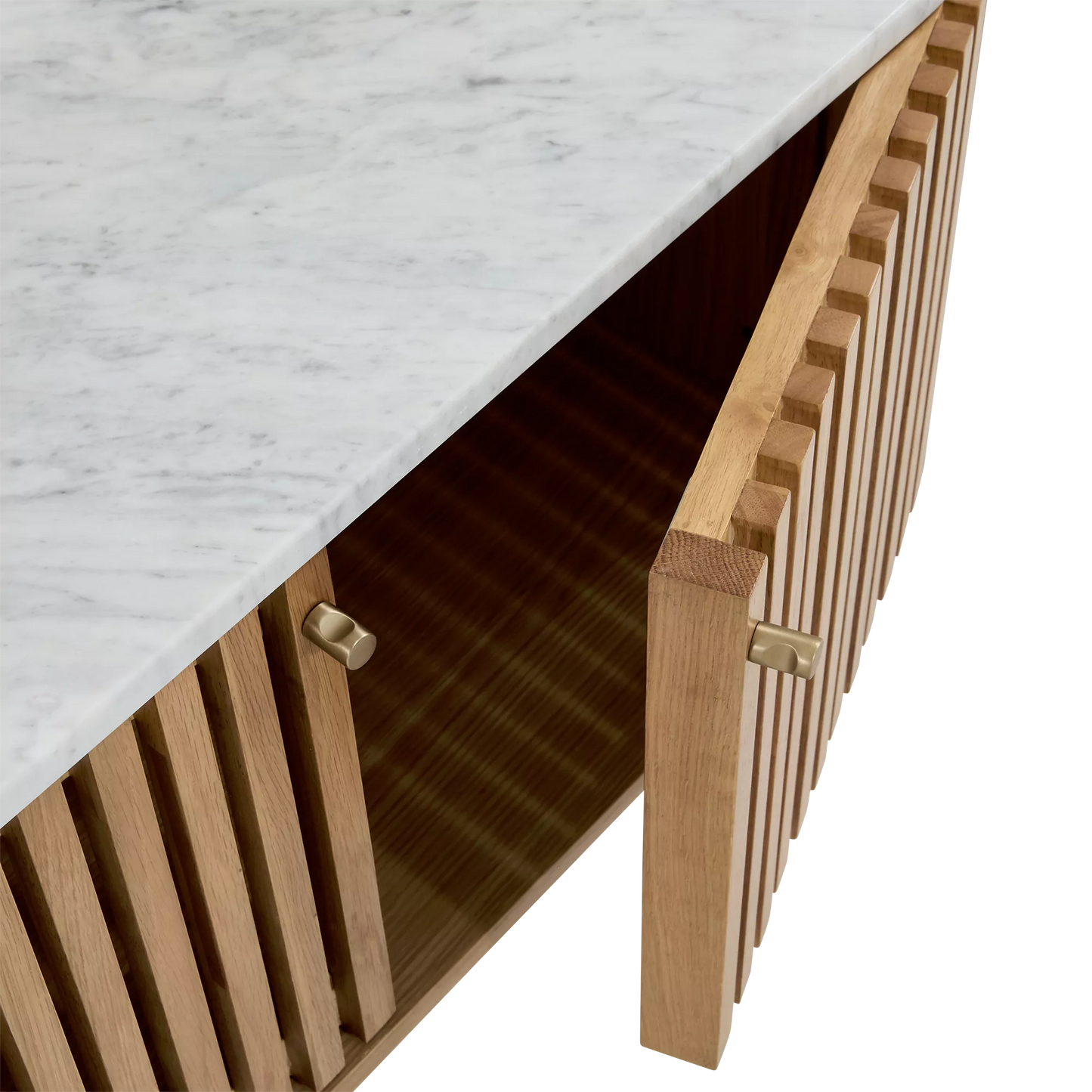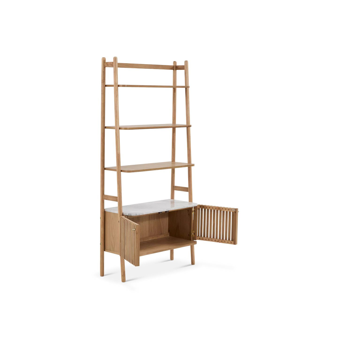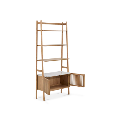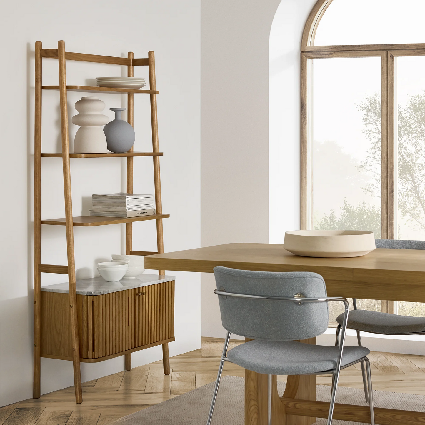 • Open shelving offers a stage to display curated decor while keeping items accessible.