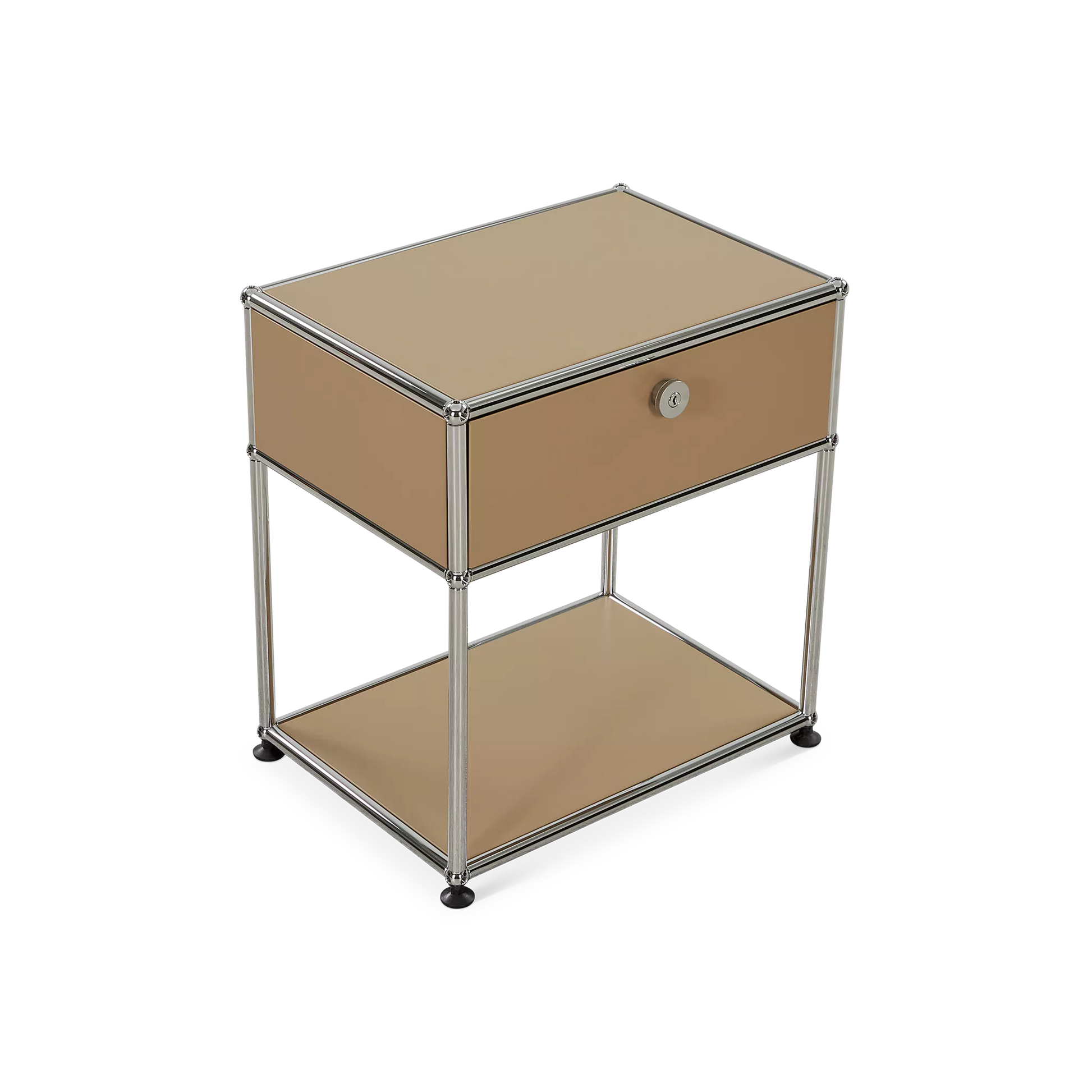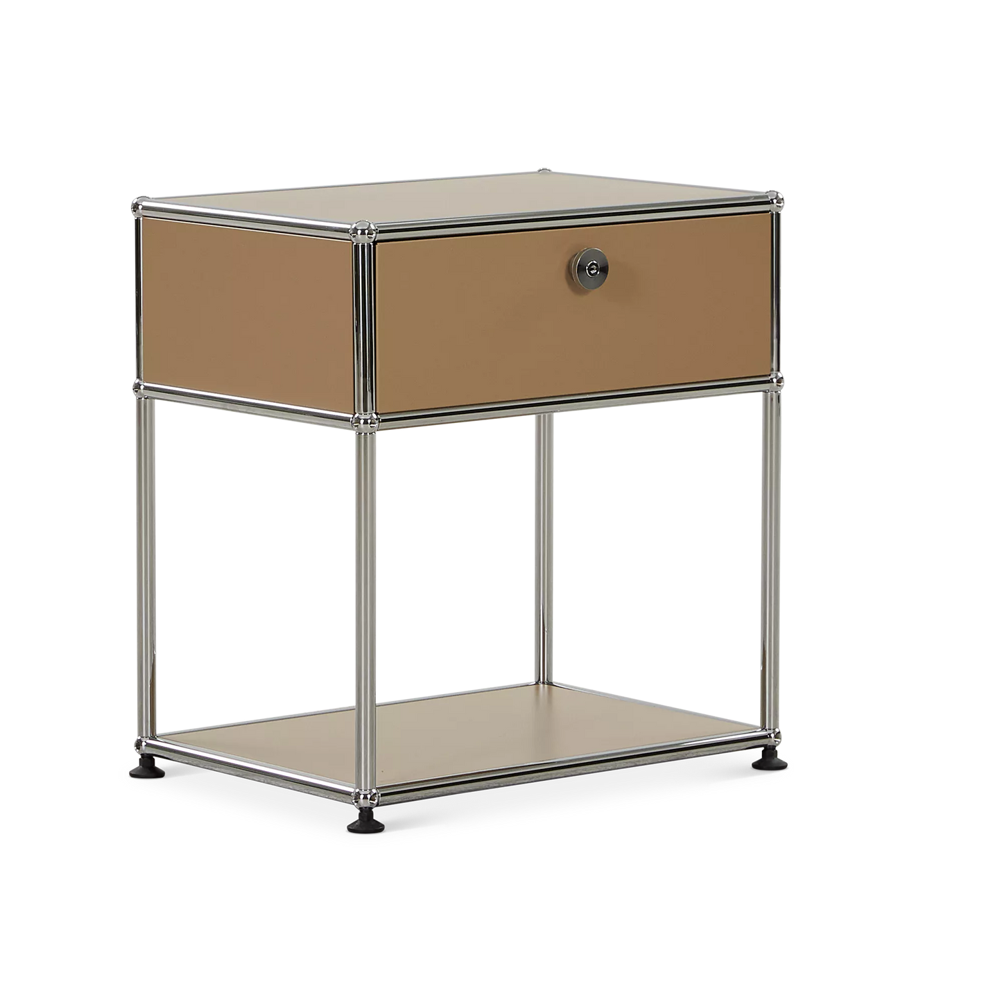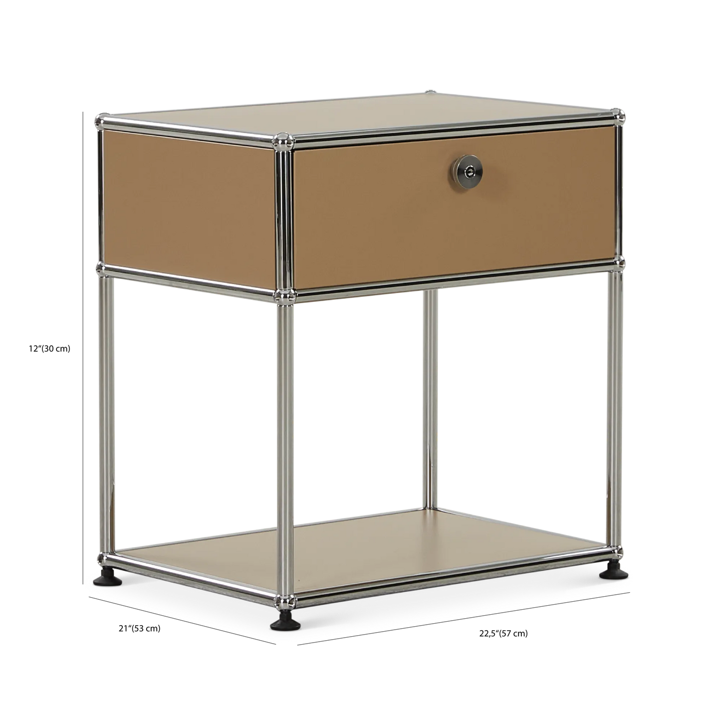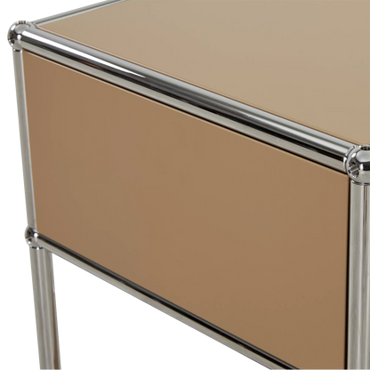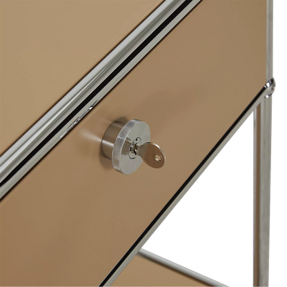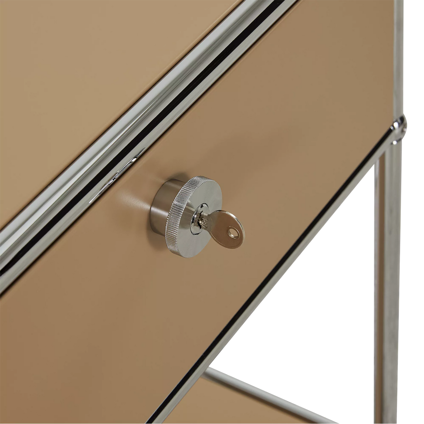 Inspired by the core industrial design principles of the 1930s, ’40s and ’50s, the Sori nightstand combines clean lines with a bold, retro-chic look. Its tubular chrome steel frame, riveted corners, and locking drawer recall classic workshop furniture, reimagined through a modernist lens for a result that’s functional and decorative in equal measure.