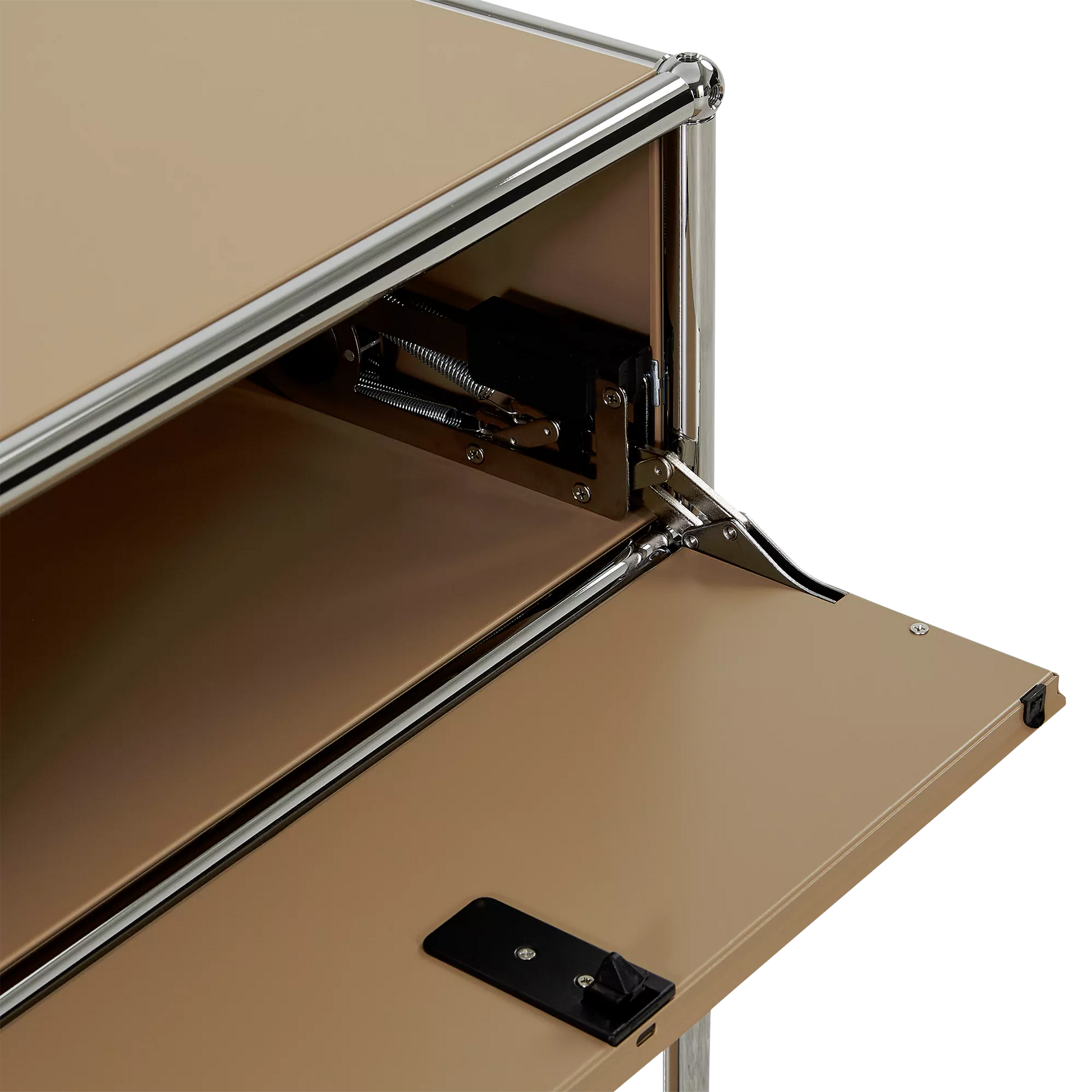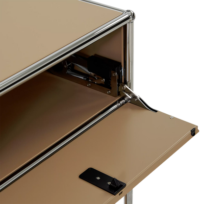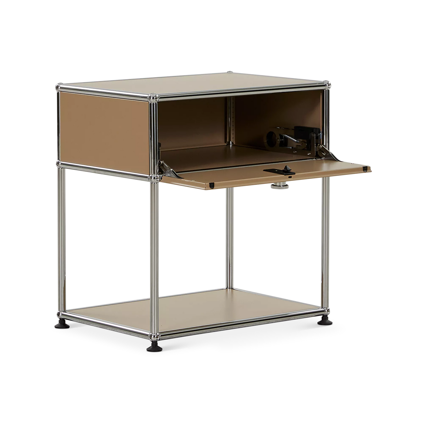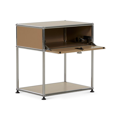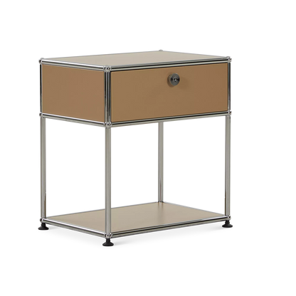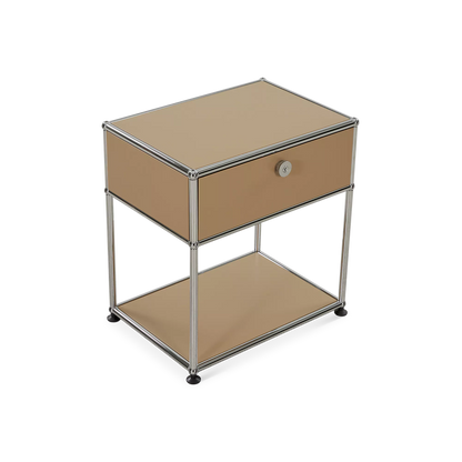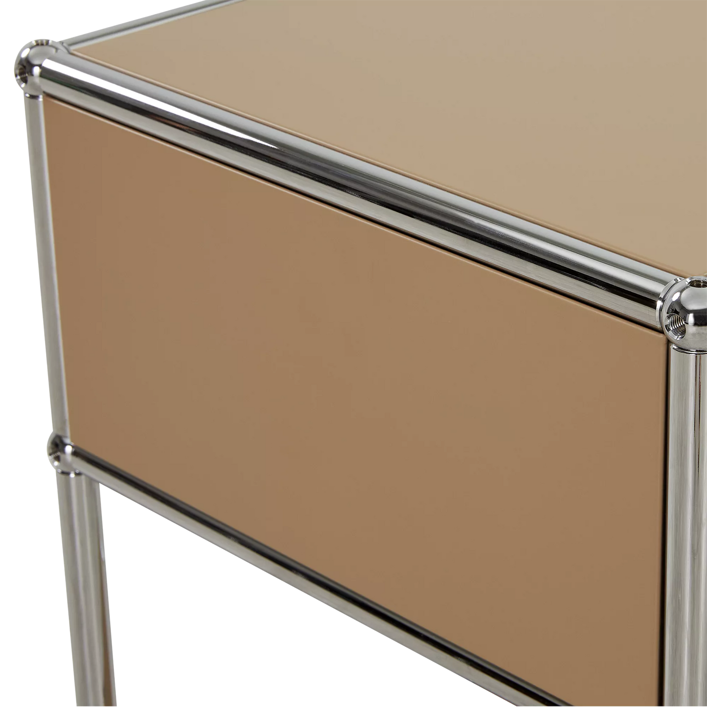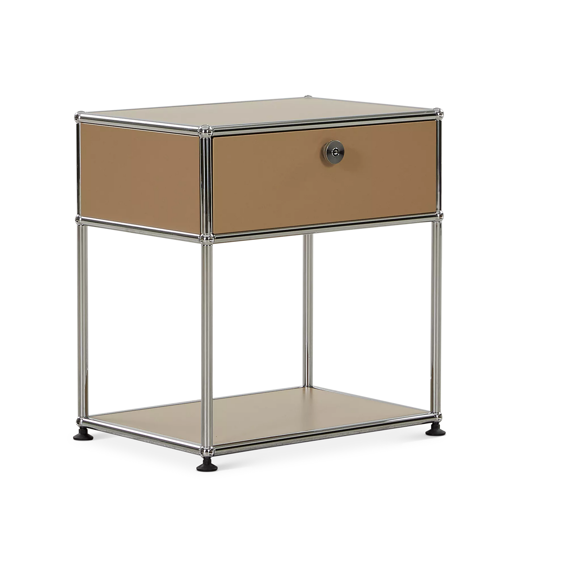 Inspired by the core industrial design principles of the 1930s, ’40s and ’50s, the Sori nightstand combines clean lines with a bold, retro-chic look. Its tubular chrome steel frame, riveted corners, and locking drawer recall classic workshop furniture, reimagined through a modernist lens for a result that’s functional and decorative in equal measure.
