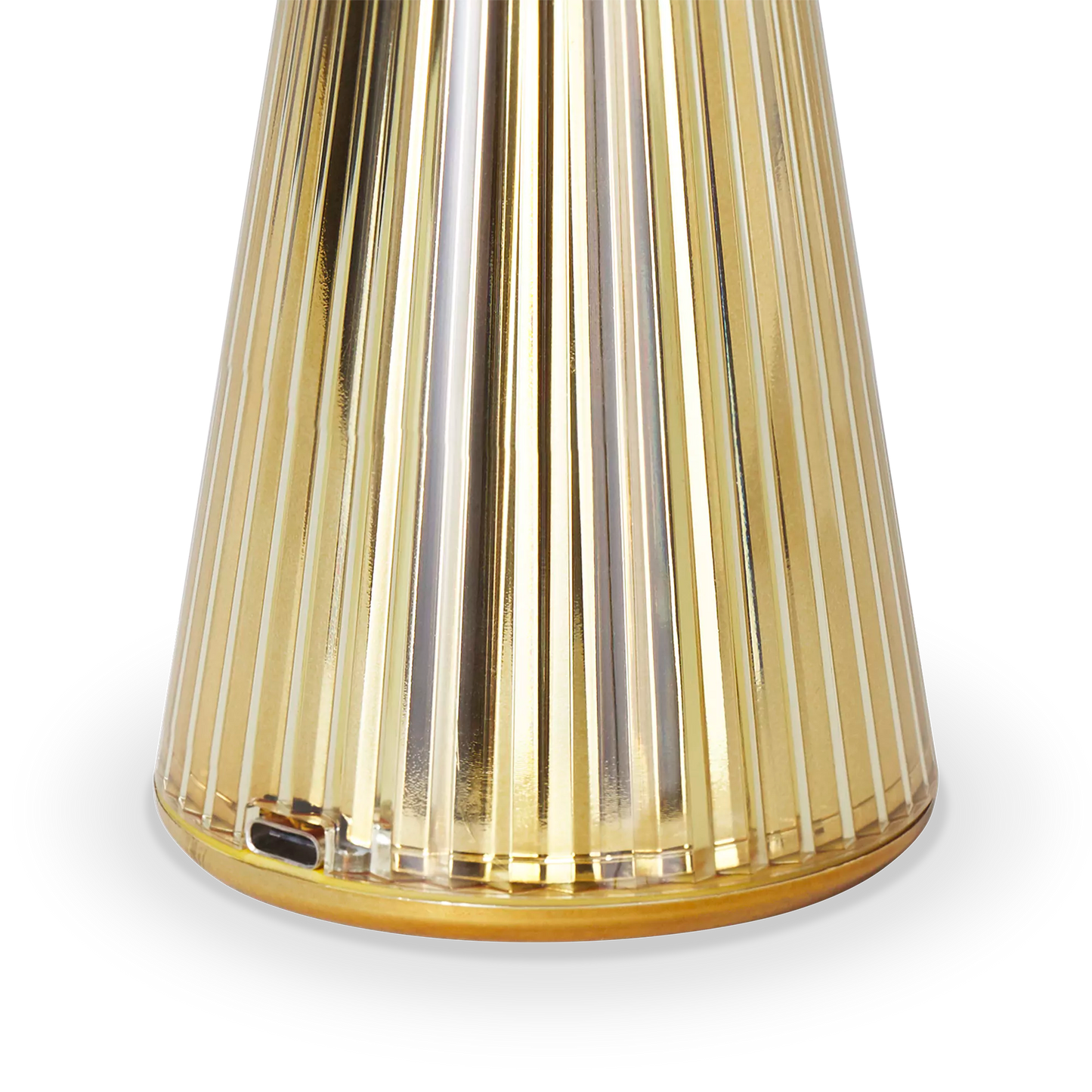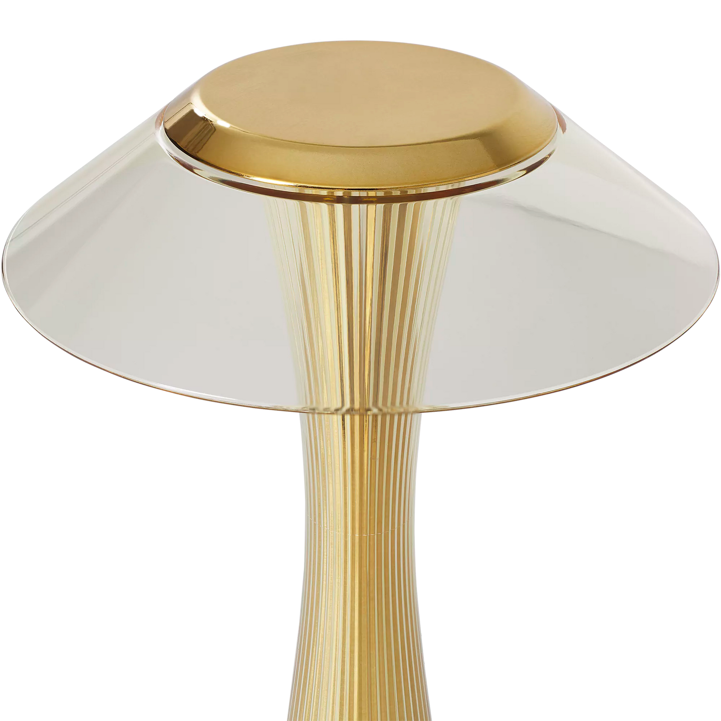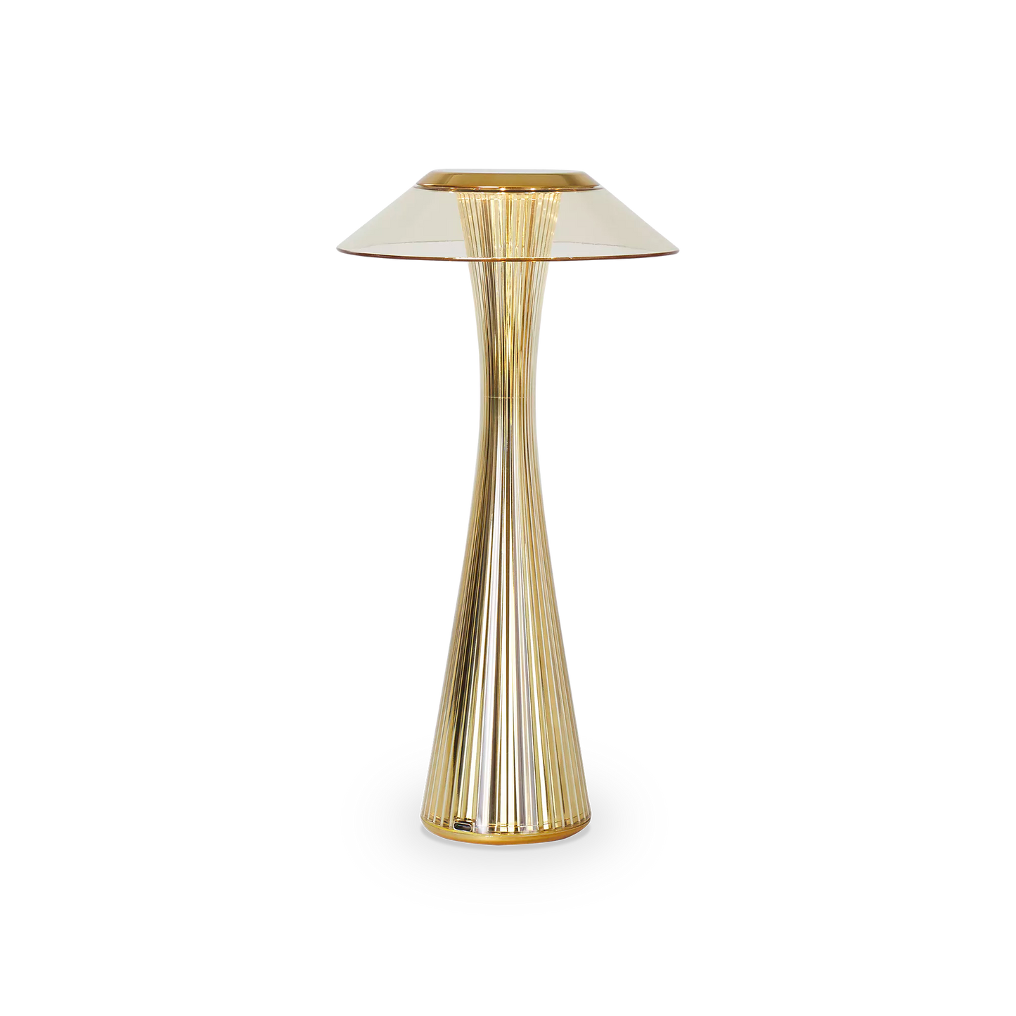 Reminiscent of Seattle's futuristic Space Needle, this rechargeable lamp lives up to its name. Its transparent shade is mounted on an elongated base with gently curved lines and a tapered centre. It’s finished with a luxe golden hue for an alluring and avant-garde look.