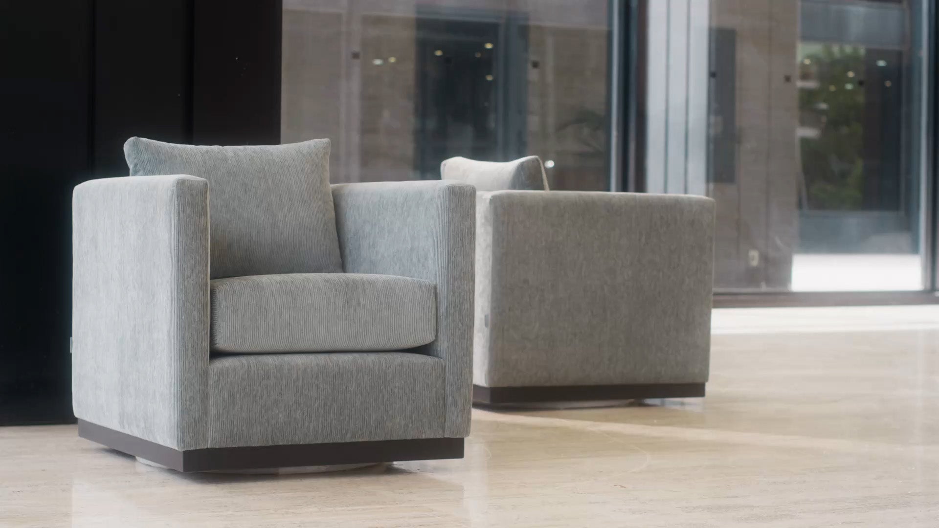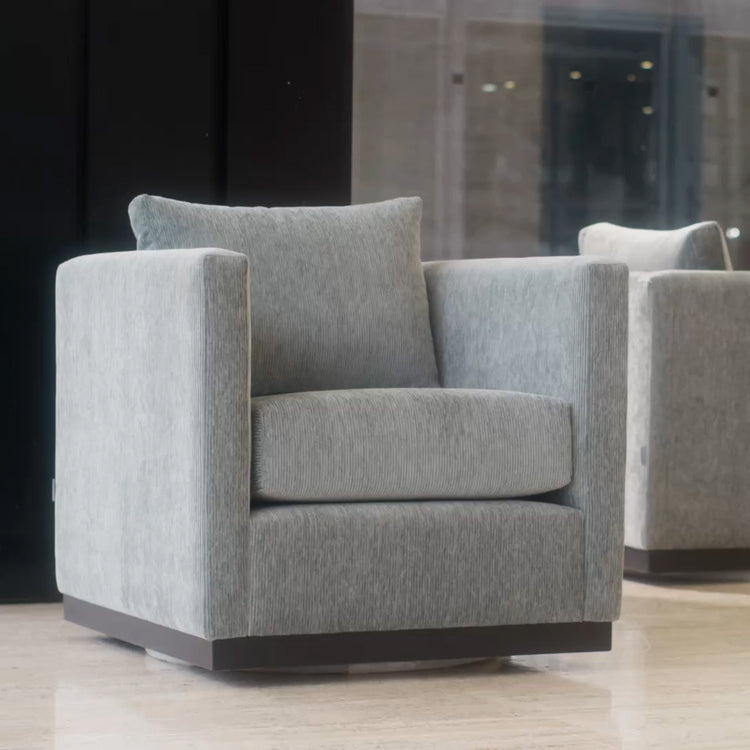 Resolutely timeless, the Spin swivel chair stands out with a square shape, soft, heathered fabric upholstery and plush cushions. An exclusive, Canadian-made design.