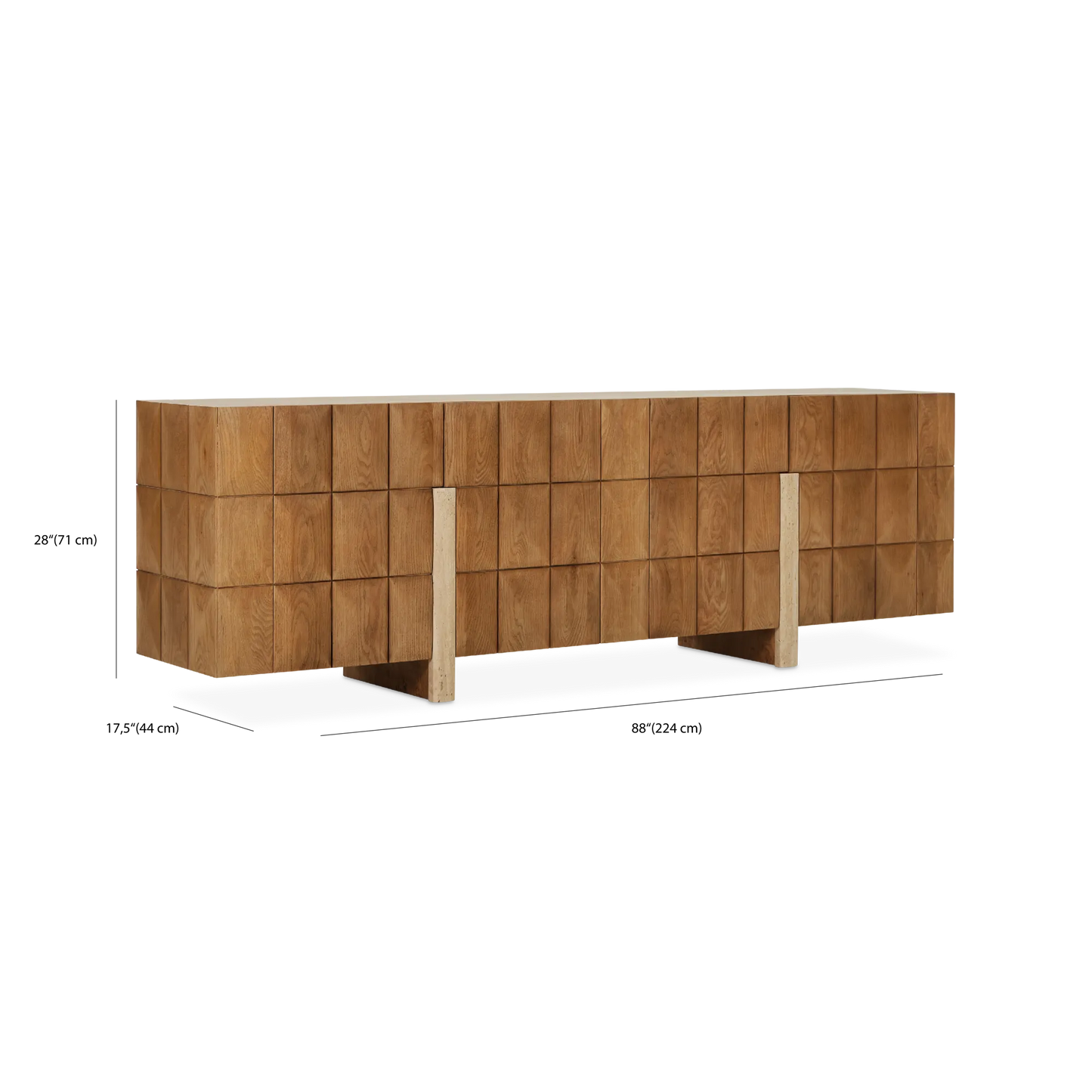 The Squires sideboard makes a bold statement through texture and materiality. Crafted in richly grained barley oak, it brings dynamism and dimension to any living or dining space with its rhythmic, grid-pattern façade. Wraparound travertine legs ground the design while striking a balance between natural warmth and strength. A refined and character-rich design that stands out with its sculptural detailing and generous storage.