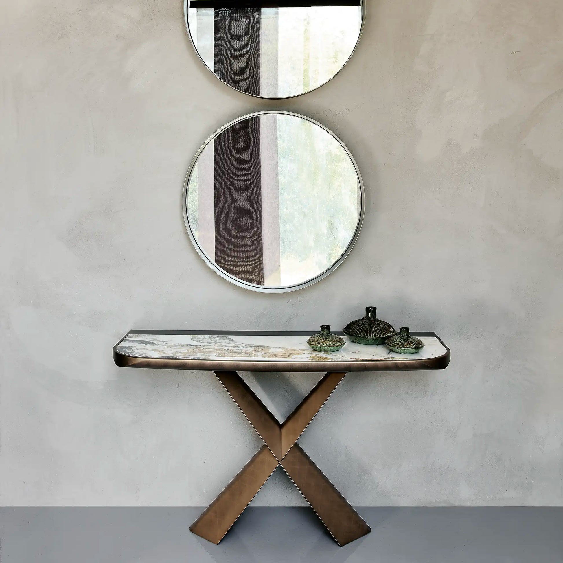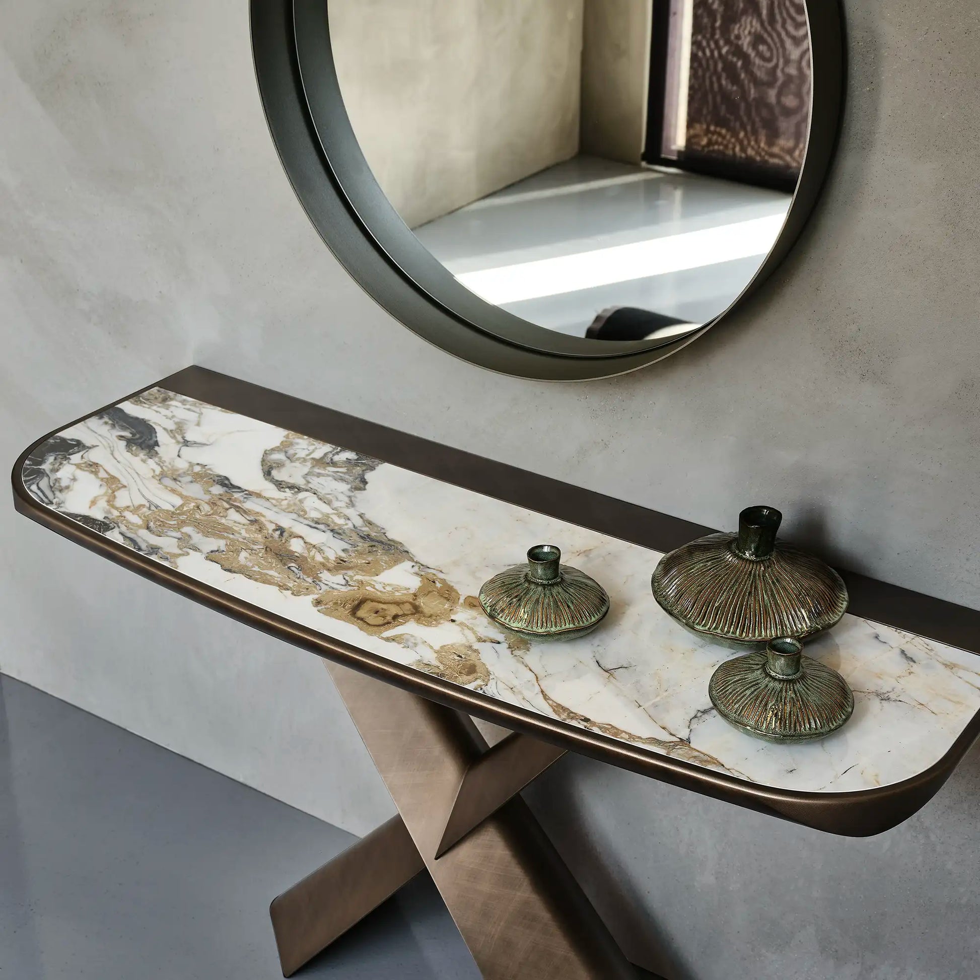 The Terminal console by Cattelan Italia stands stunningly balanced on a magnificent cross base in lacquered steel. Its ceramic top is set on top like a gemstone for an unequivocally elegant effect.