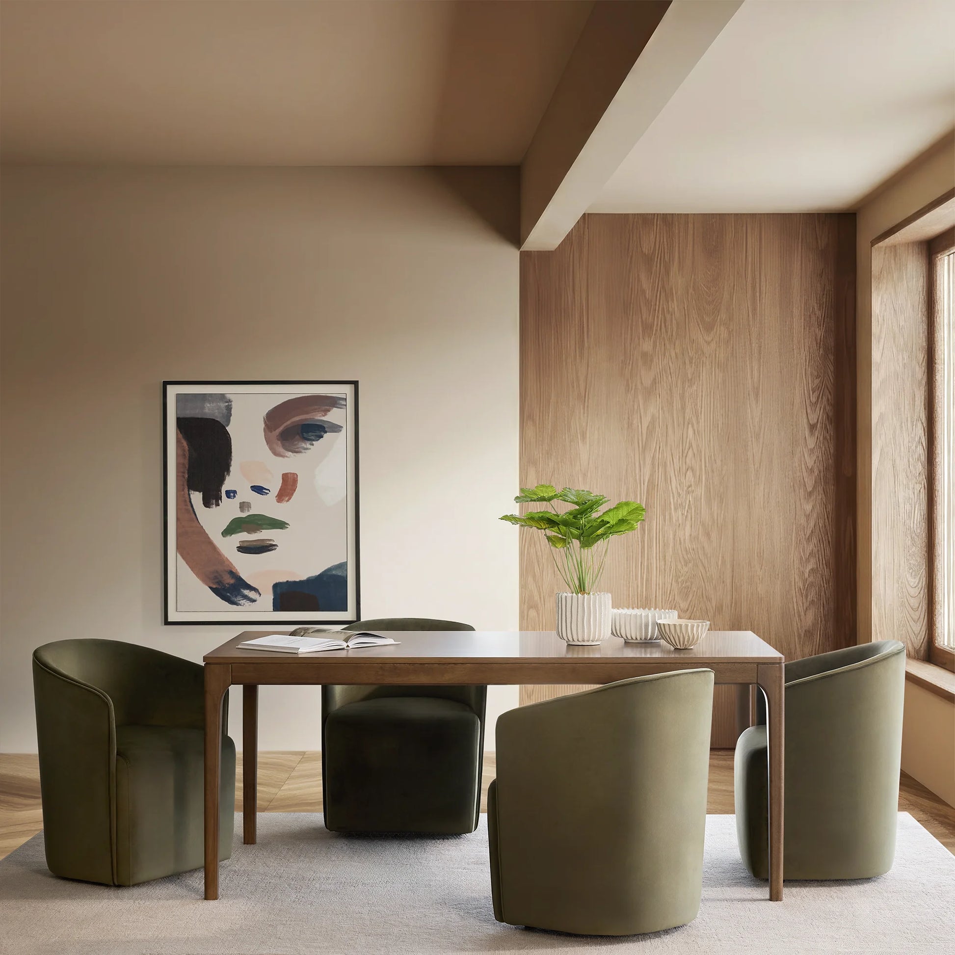Breakfast, lunch and dinner are served! Add a touch of nature to your dining room with the Timber natural oak veneer table. Its sleek design and simple lines pair perfectly with pops of colour, like chairs in olive green. Made for enjoying meals in the company of family and friends, this table looks equally at home in modern decor as it does in more classic settings.