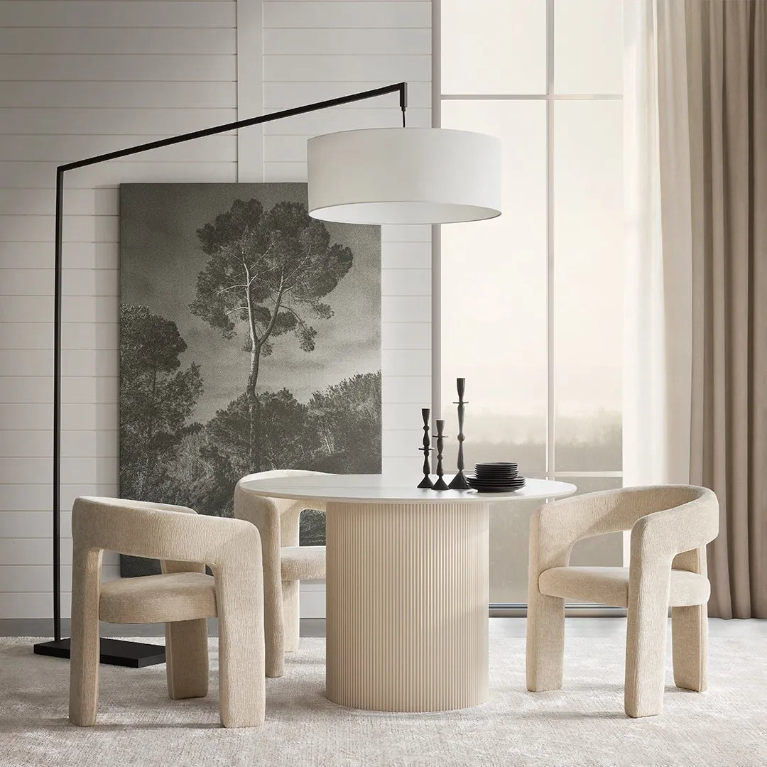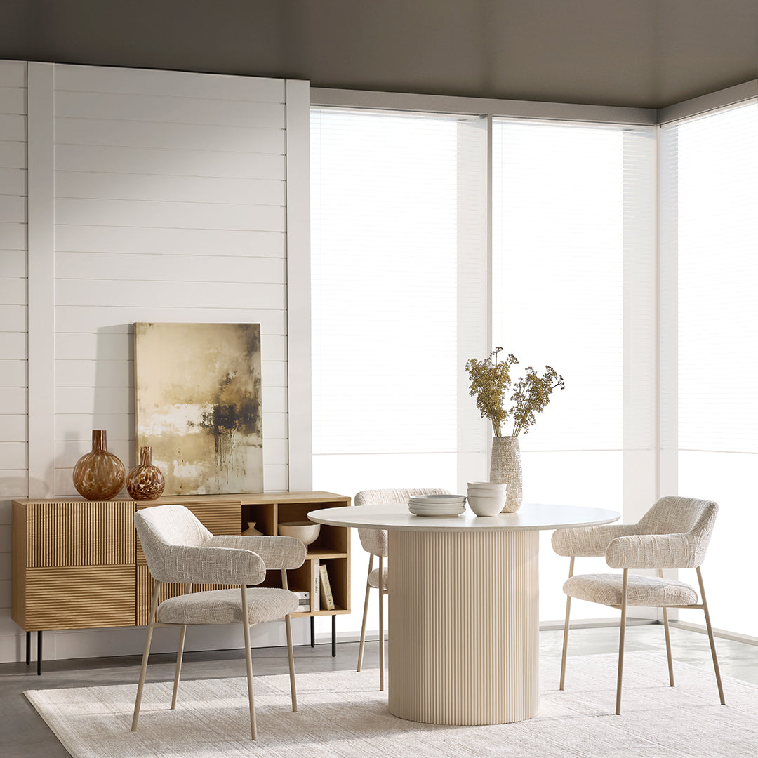 The Tovas table is sure to turn heads. It embodies a modern and warm design with its rounded shape and engineered wood construction. Perfect for minimalist or natural decors, it creates a soothing atmosphere while adding a unique, clean-lined look.