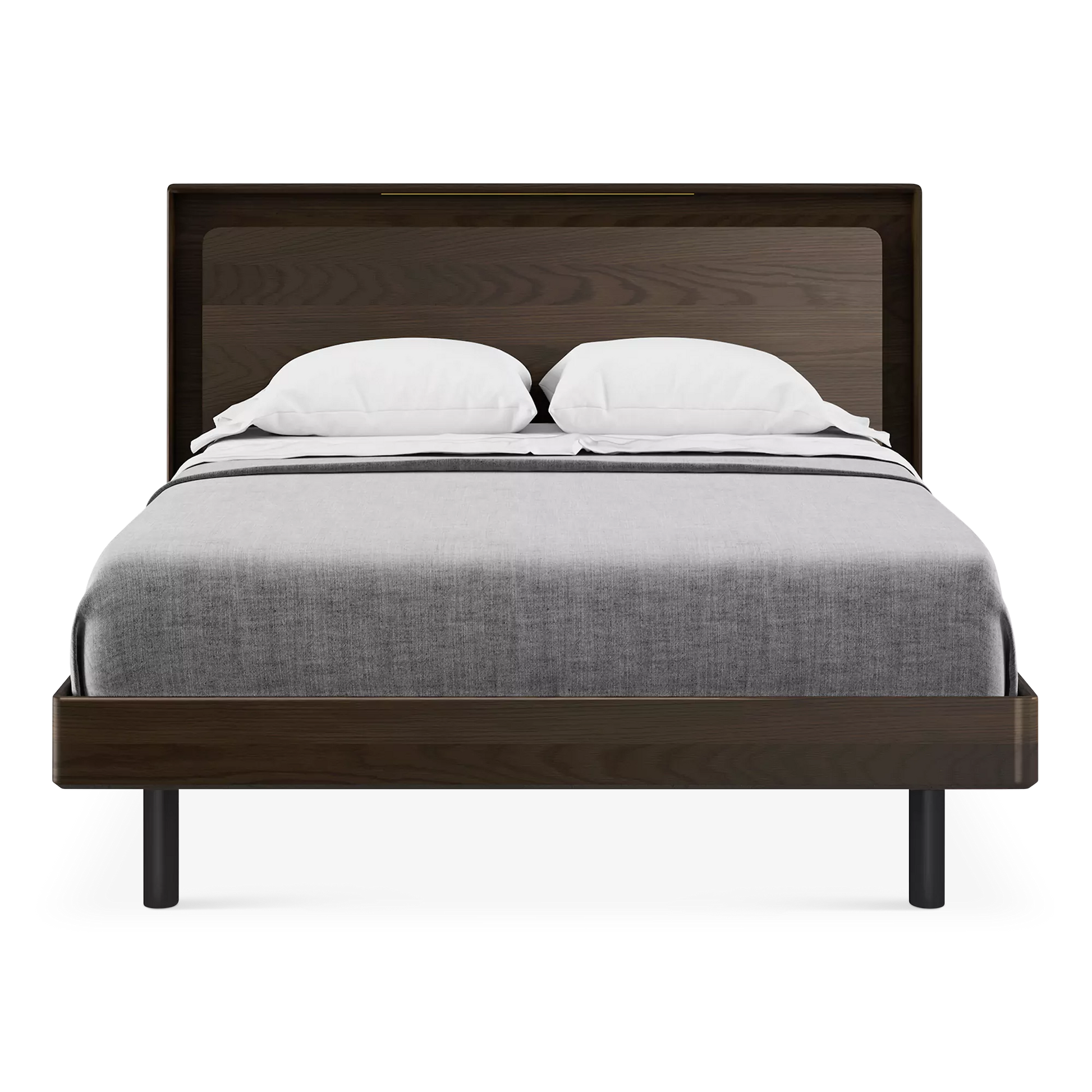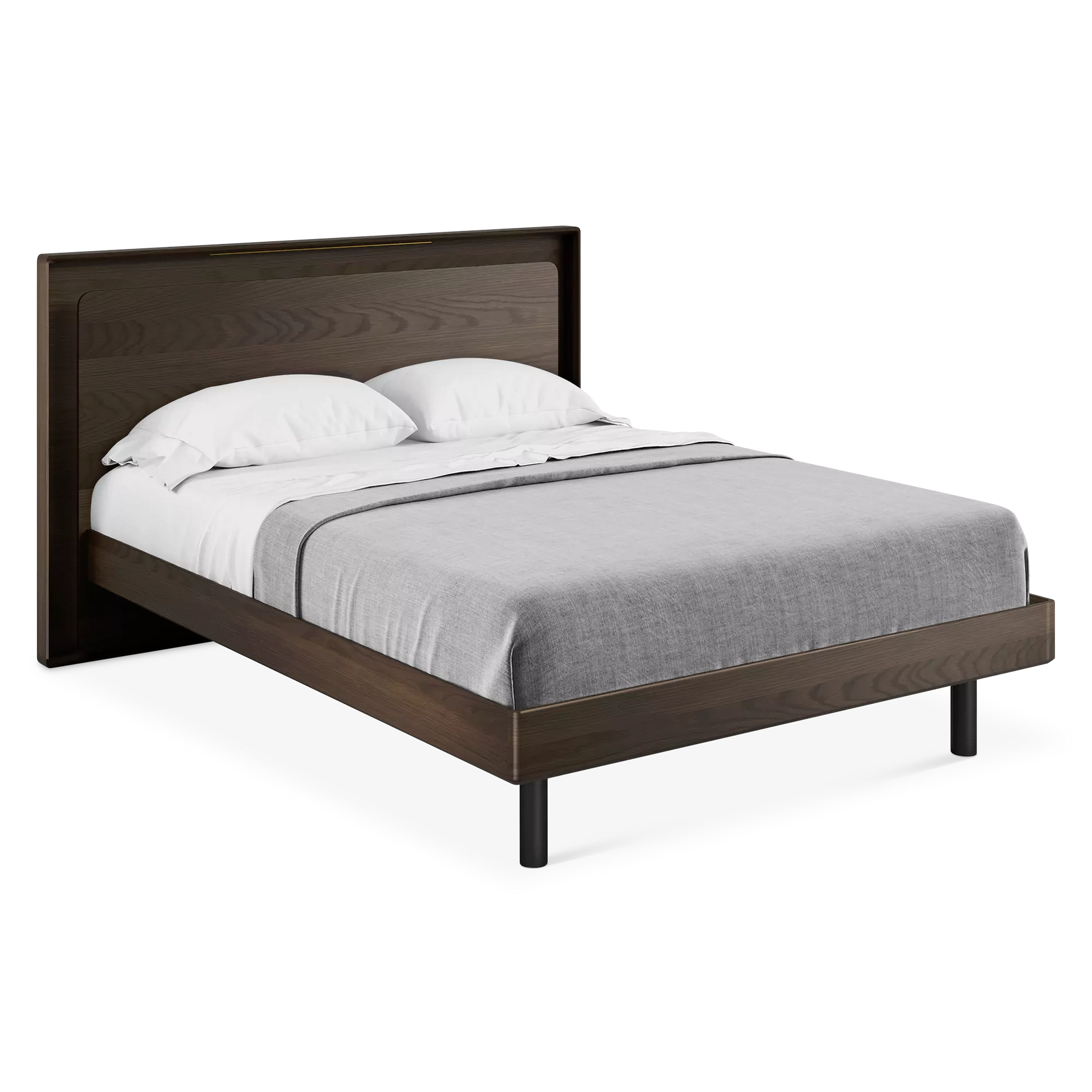 The Up-Linq bed is designed to dazzle. This model by manufacturer BDI, is the ultimate mix of elegance and modern design. Its dual-level headboard conceals dimmable lighting and integrated charging stations on each side, equipped with power outlets and USB ports. The quality of its design is also reflected in the choice of materials, including hardwood veneer, as well pine slats for the bed base wrapped in a cushioned covering to minimize vibrations. A durable design with ample style.