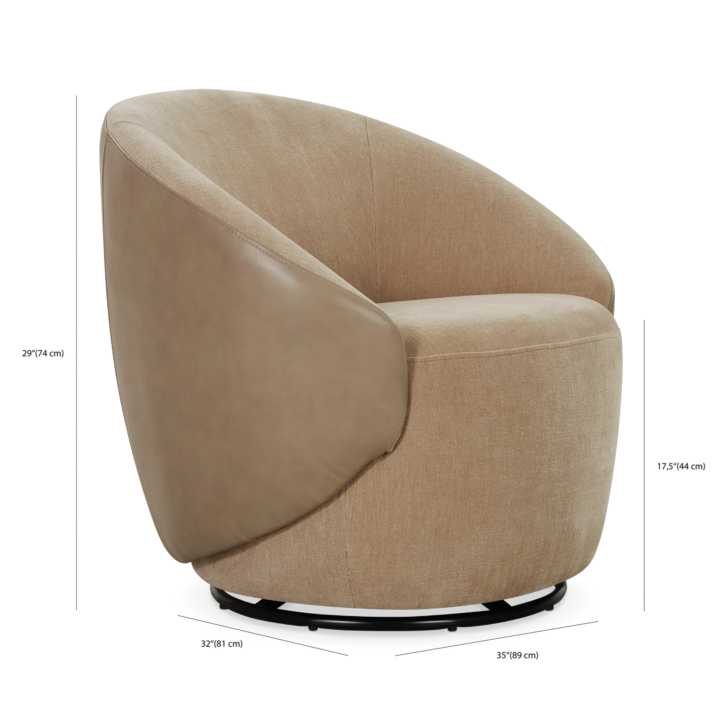 The Velin armchair invites you to slow down. Its welcoming seat is enveloped by a curved backrest in fabric and leather. Mounted on a swivel base, it naturally moves with you. Ideal for a sleek living room, office or a refreshed reading nook.