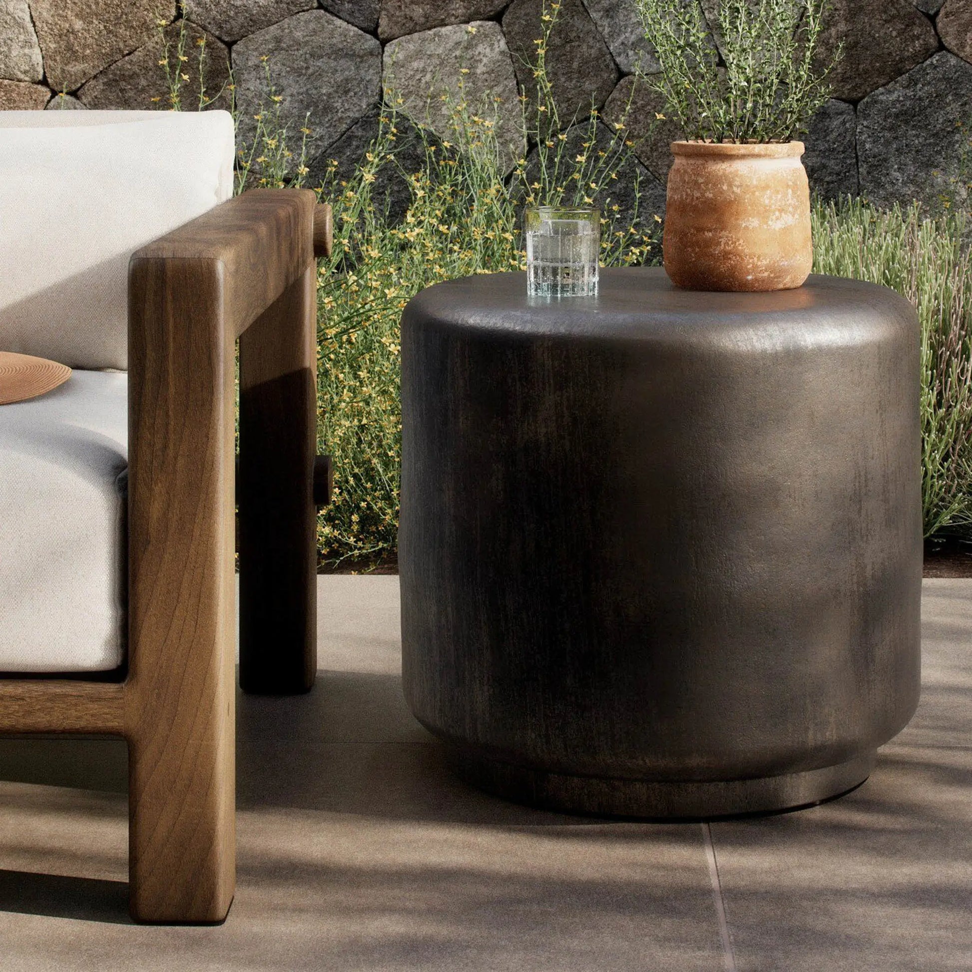Venetia is strikingly simple with its cylindrical silhouette and subtly narrowed base. Made from woven polyethylene, it’s designed to be both durable and airy for outdoor use. Cover or store inside during inclement weather and when not in use.