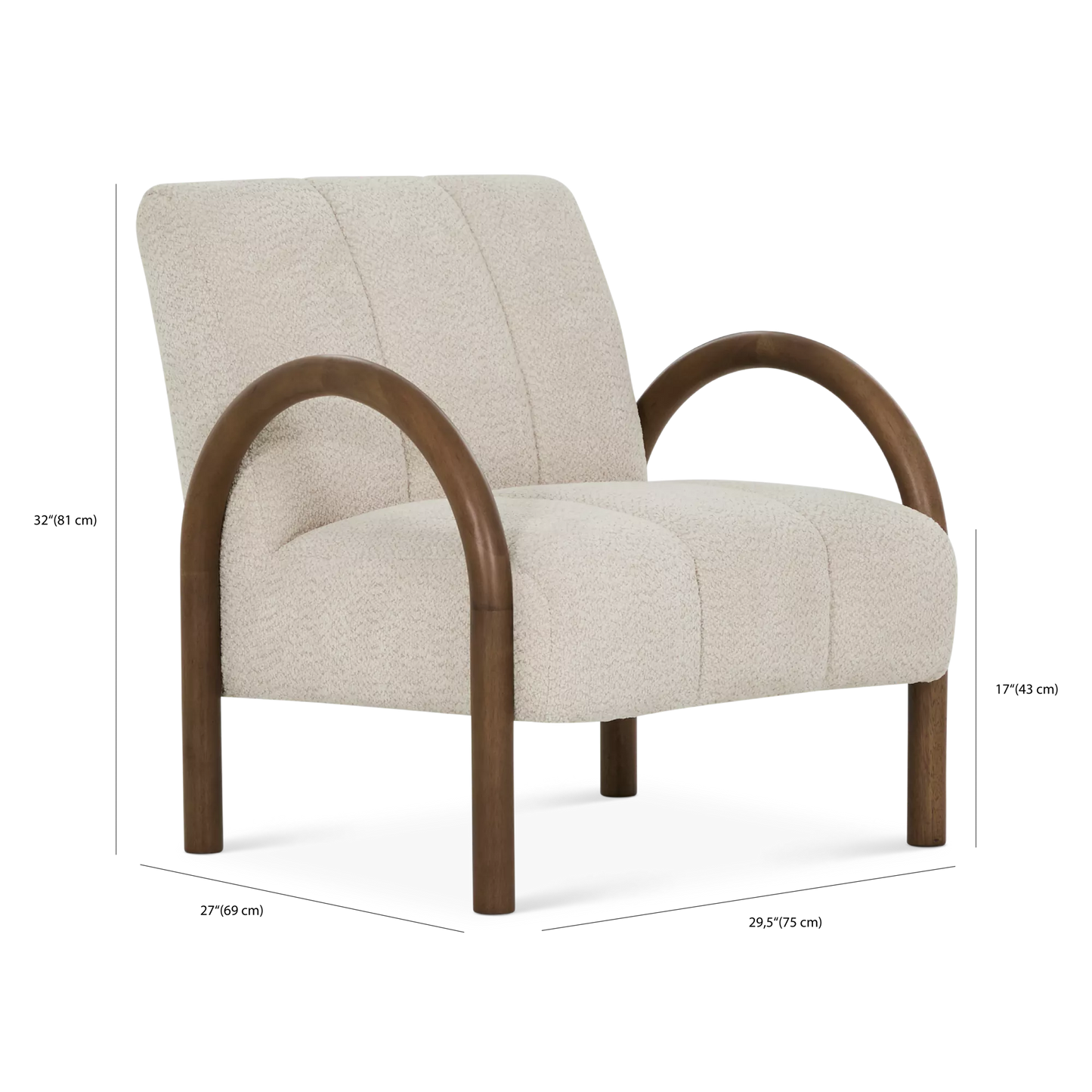 The Wiseman armchair invites relaxation with its soft, beige bouclé fabric and sculpted, chocolate-brown wooden arms. Delicate stitching adds a refined touch, while its contemporary style fits effortlessly into any living room or reading nook.