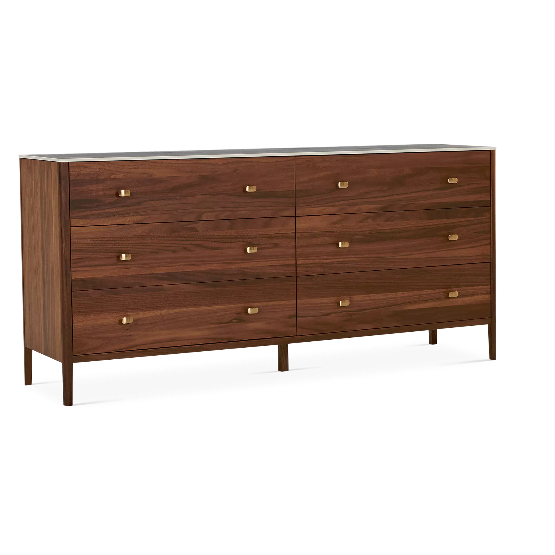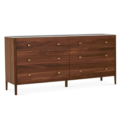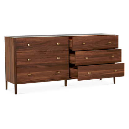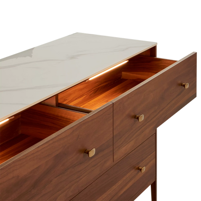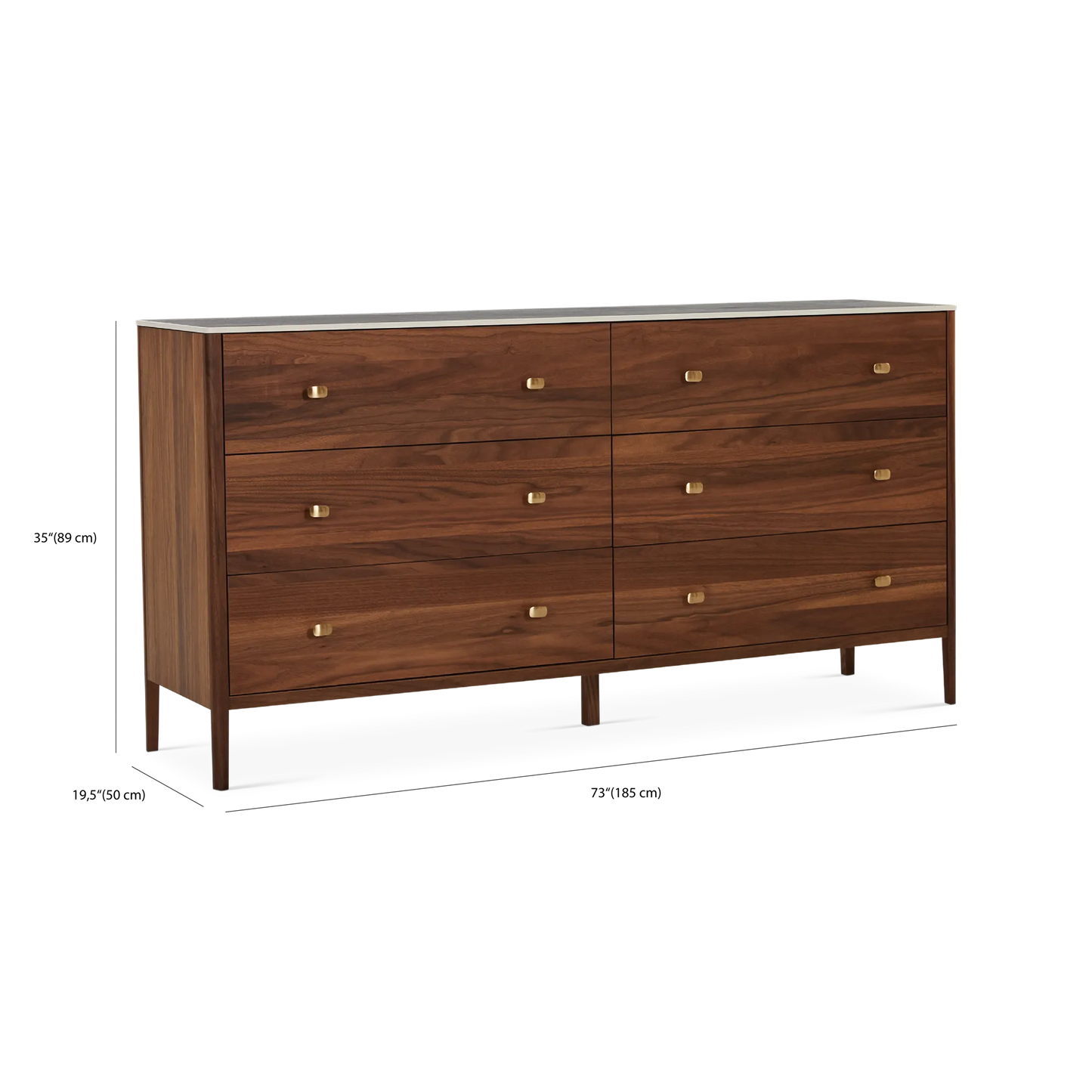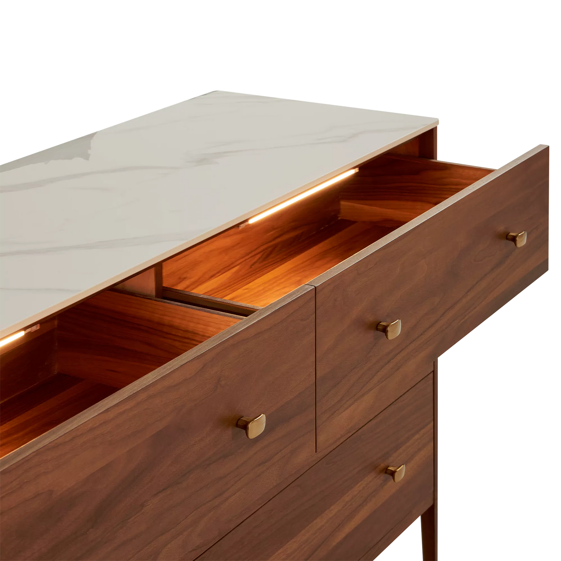 Sleek functionality meets refined design with the Zara 6-drawer dresser. Crafted from smoked walnut wood, topped with elegant porcelain and illuminated by subtle LED lighting in the top drawers, this spacious dresser is as beautiful as it is practical. The soft-close slides of its drawers ensure a smooth, silent experience, culminating in a sophisticated storage solution for any modern, thoughtfully designed space.