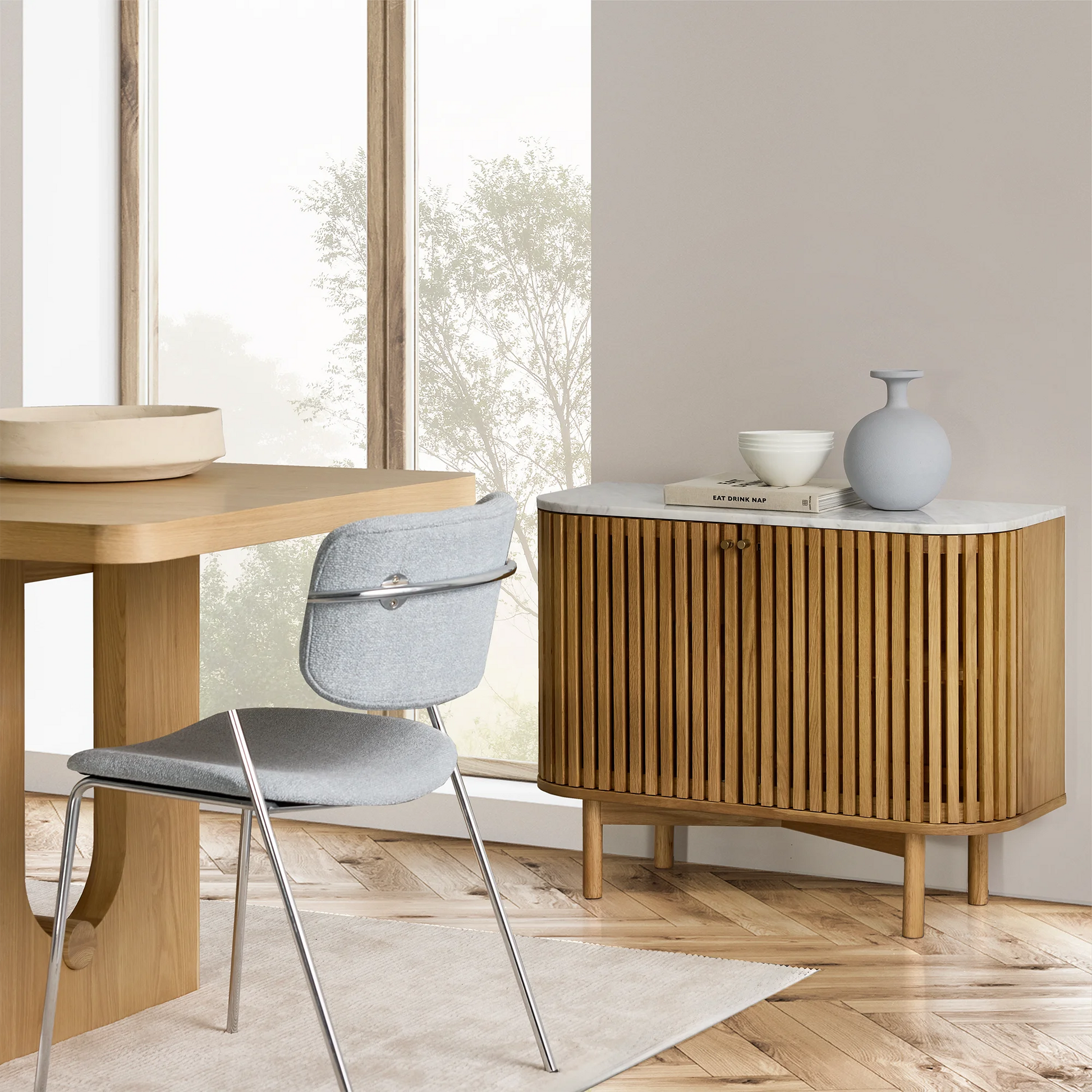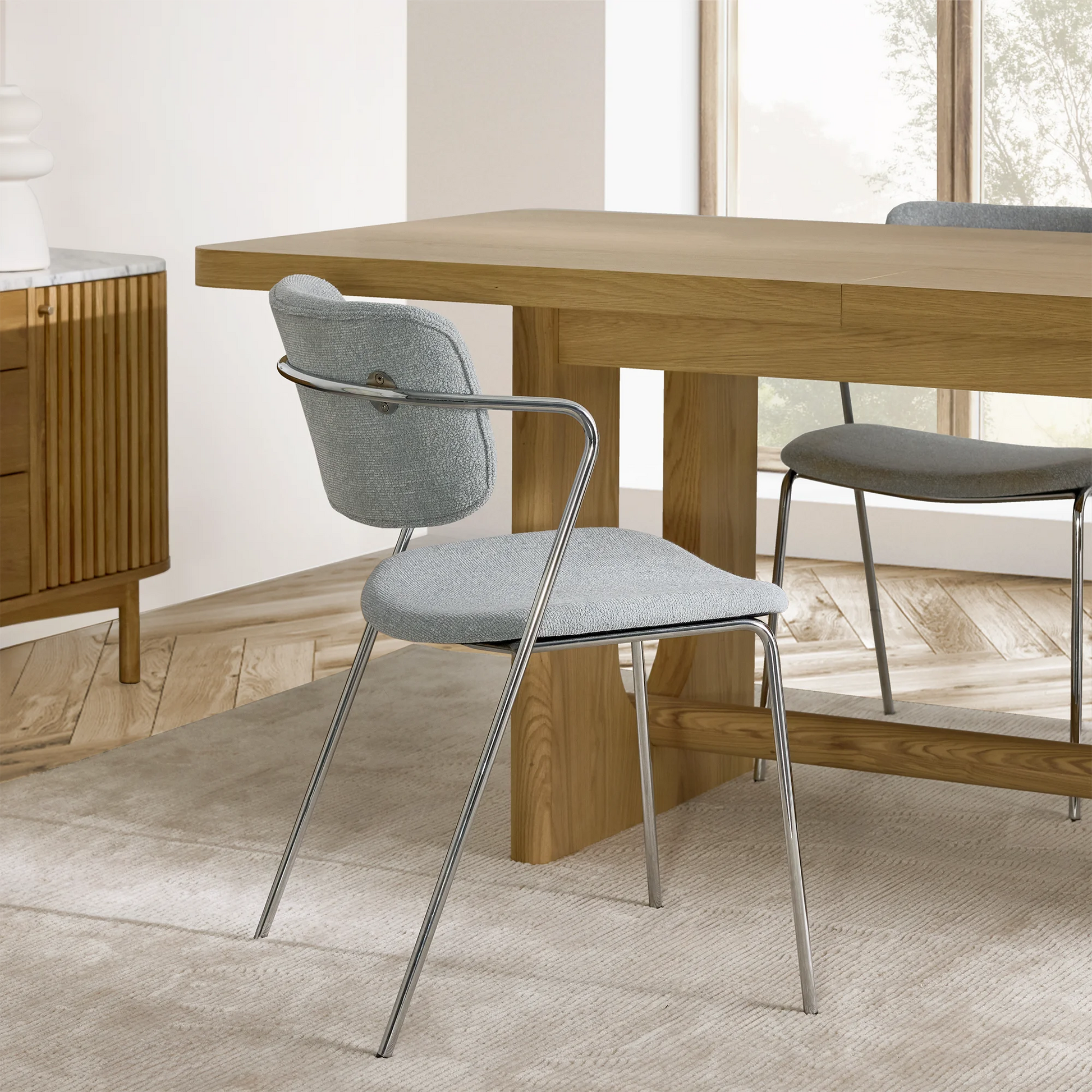 Chic yet laid back, modern yet timeless, solid yet airy…the Zed dining chair is a study in dichotomies. Its black metal frame, which extends into armrests, supports a backrest and a comfortably angled seat, both wrapped in soft fabric. The epitome of contemporary comfort, it pairs just as well with minimalist interiors as it does with richer decors.